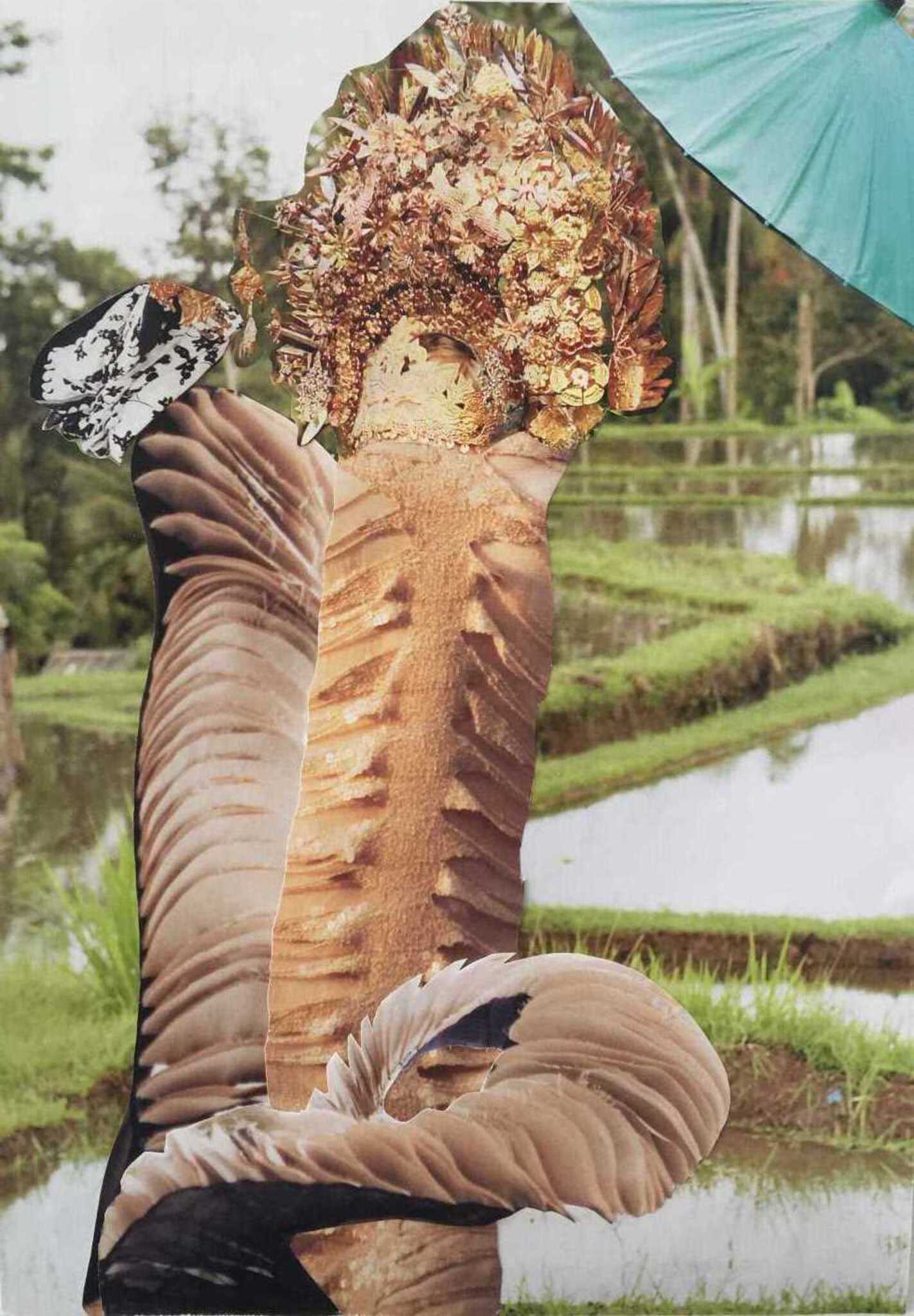 Surreeel Spiritueel Goud Kleurig Papier Flow Verhalend Collage Papierkunst Spiegel Positief Intuïtief Artiest Kunstenaar Hoofdtooi Verhaal Parasol Bali Rijstveld Bewegend Lijm Beeldverhaal Boodschap Schaar Papierkunstenaar