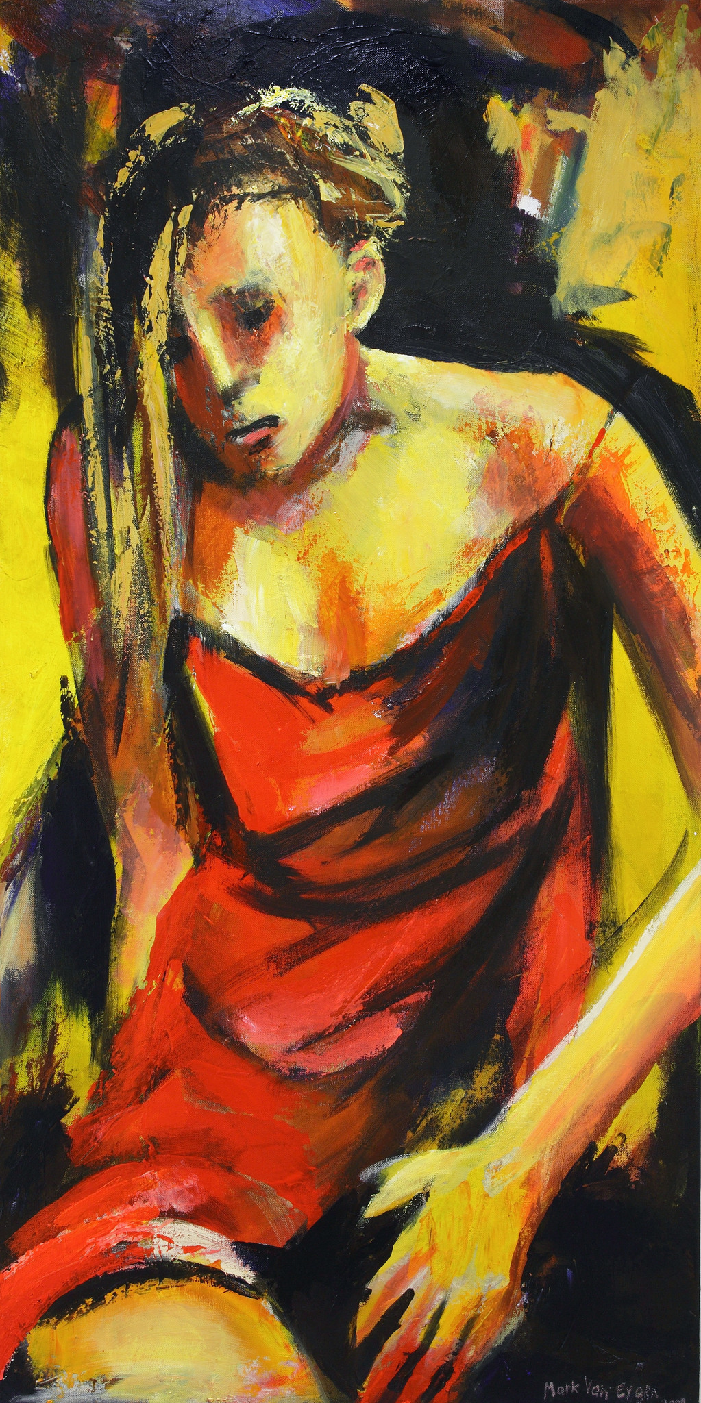 vrouw in rode jurk, sluit aan bij de drie andere vrouwen in zelfde formaat en techniek