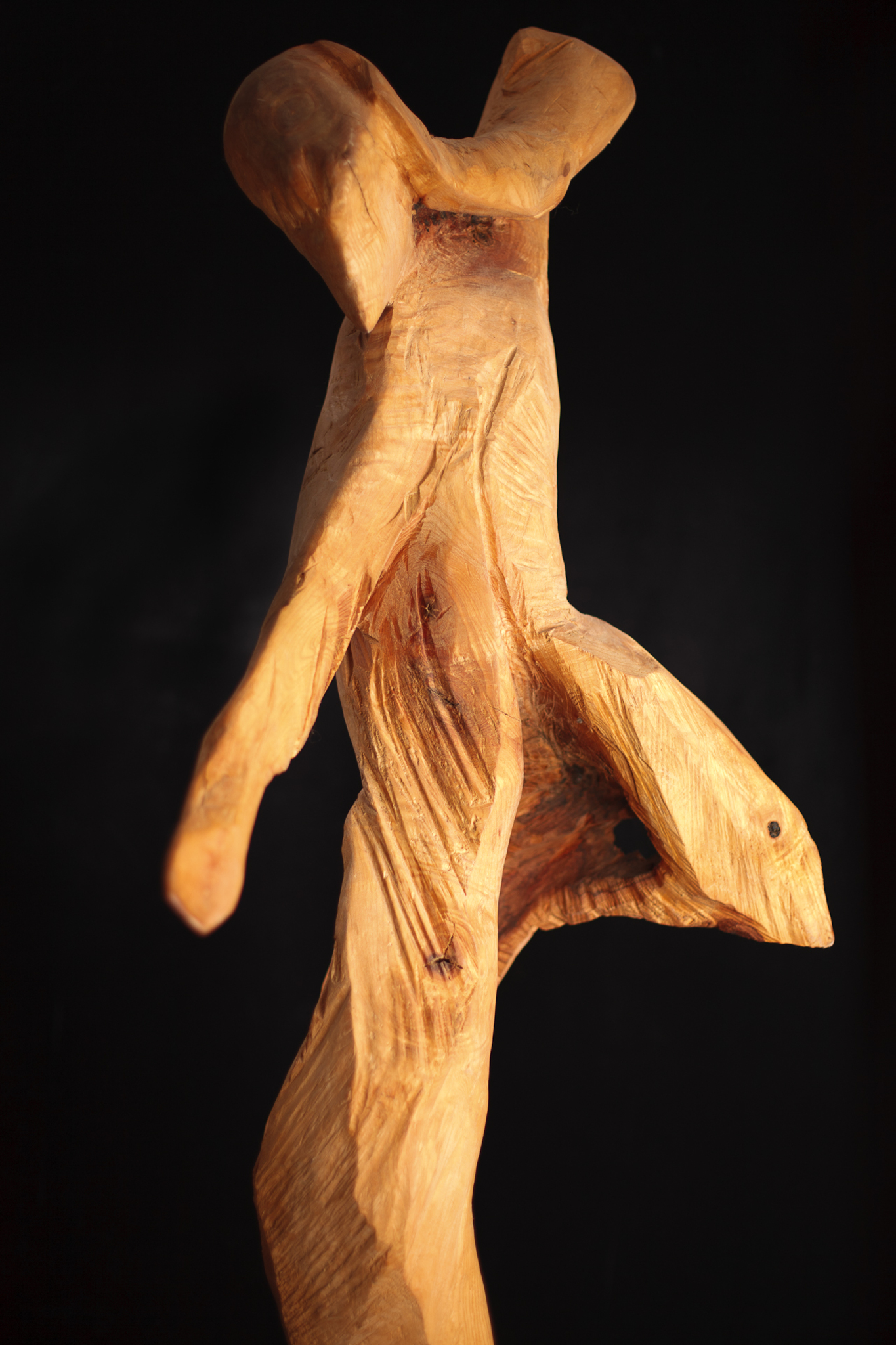 Een werk in olm (of iep zo je wil), op een hoge sokkel zodat de figuut op je neerkijkt. Hij wil loskomen van de grond, durft niet. De structuur van het hout is nog duidelijk zichtbaar door de moeten (of 'weren') en de strepen van de kettingzaag.