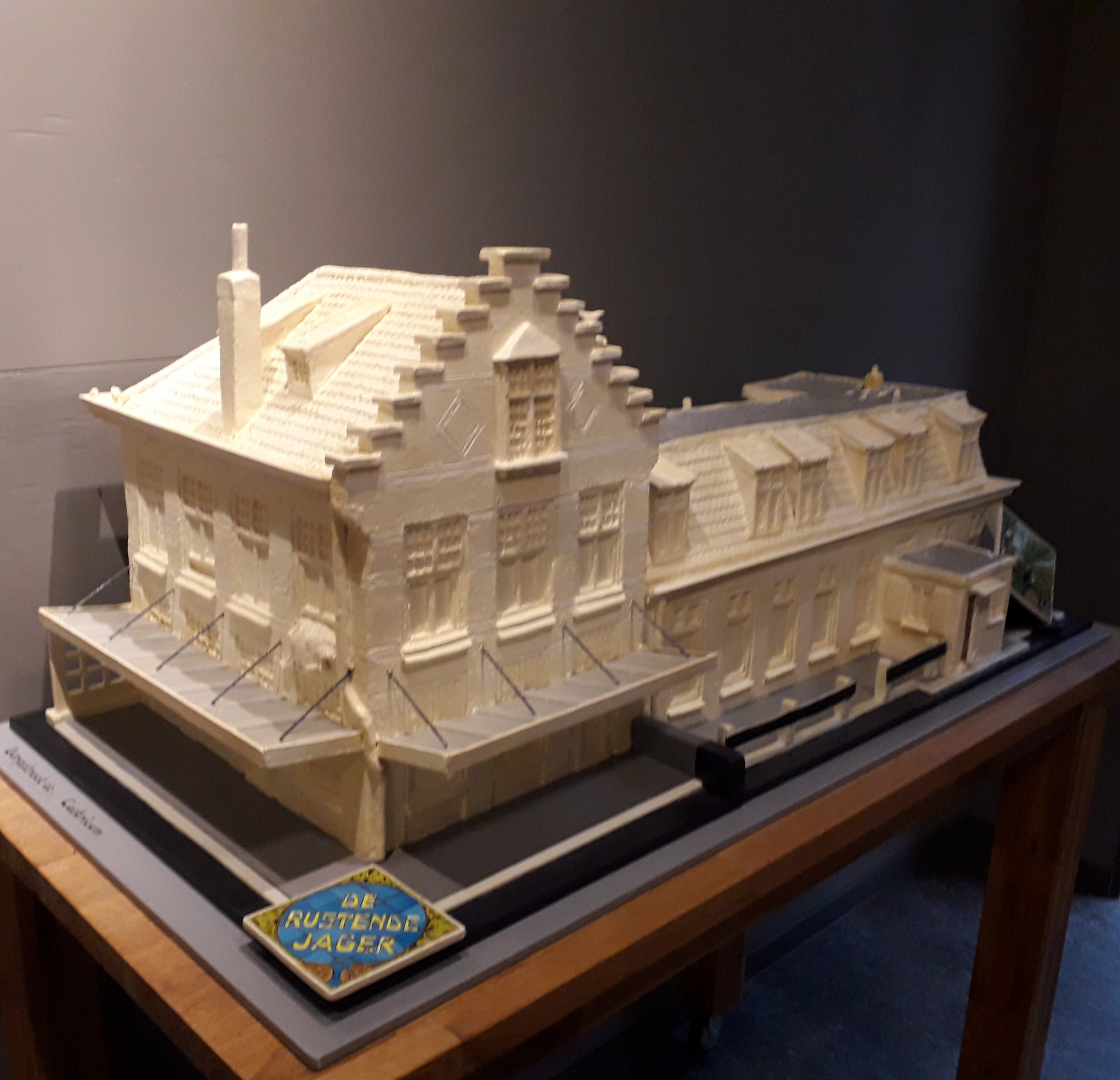 Dit Hotel / Restaurant is rond 1910 gebouwd en in 1976, onder veel protest, gesloopt. Aan de hand van hele oude ( vooral zwart/wit ) foto's, heb ik deze replica gemaakt van 40 kilo charmotte klei. Ik ben hier 6 maanden mee bezig geweest , al met al ruim 300 uur. Breedte 110 cm. Geschonken aan de werkgroep Oud-Castricum
