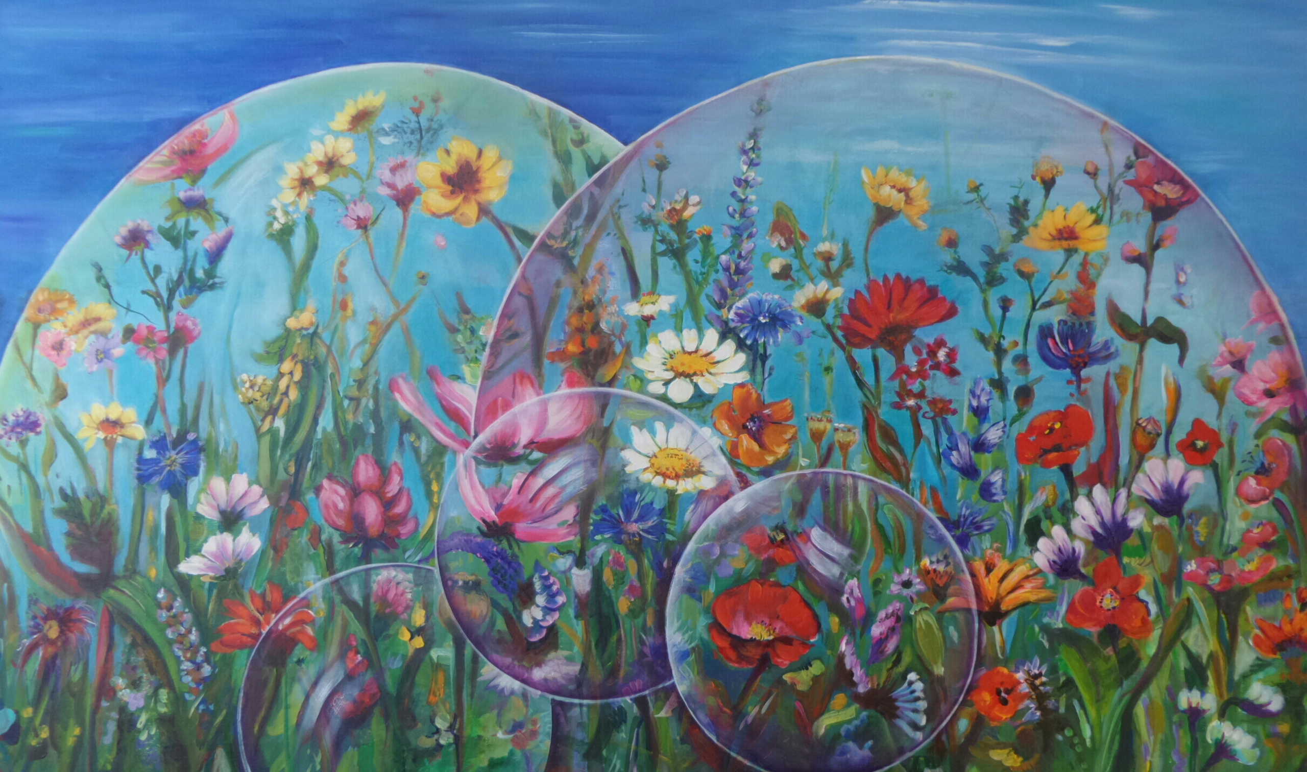 Bont werk met veel bloemen...eerst in acryl en verfijnd met olieverf.