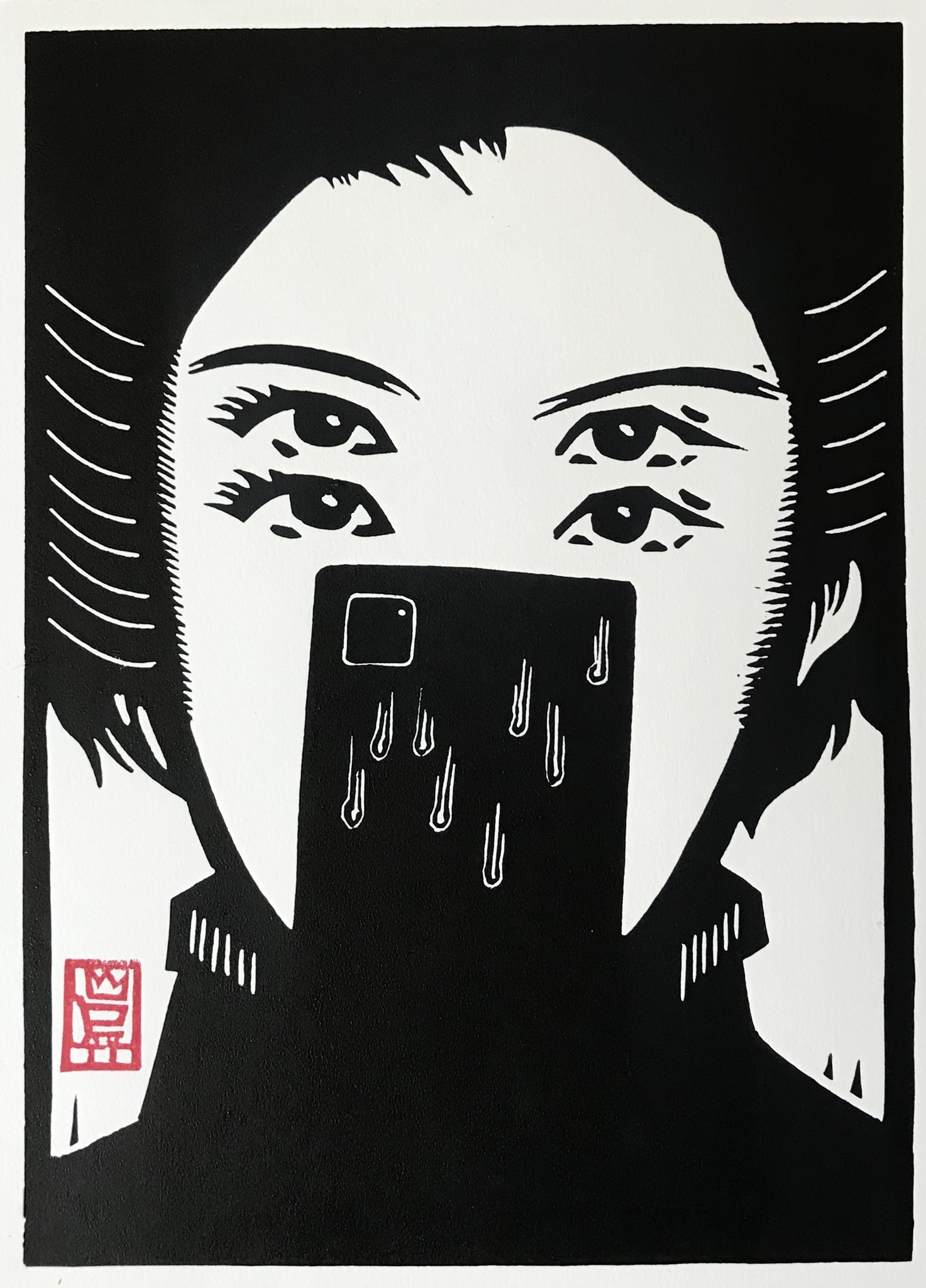 Grafiek Female Face Print Lino Japan Fear Linosnede Phone Prent Linodruk Rexwinkel Rex Social Distance Printmaking Printmaker Grabado Printstudio Socialdistance