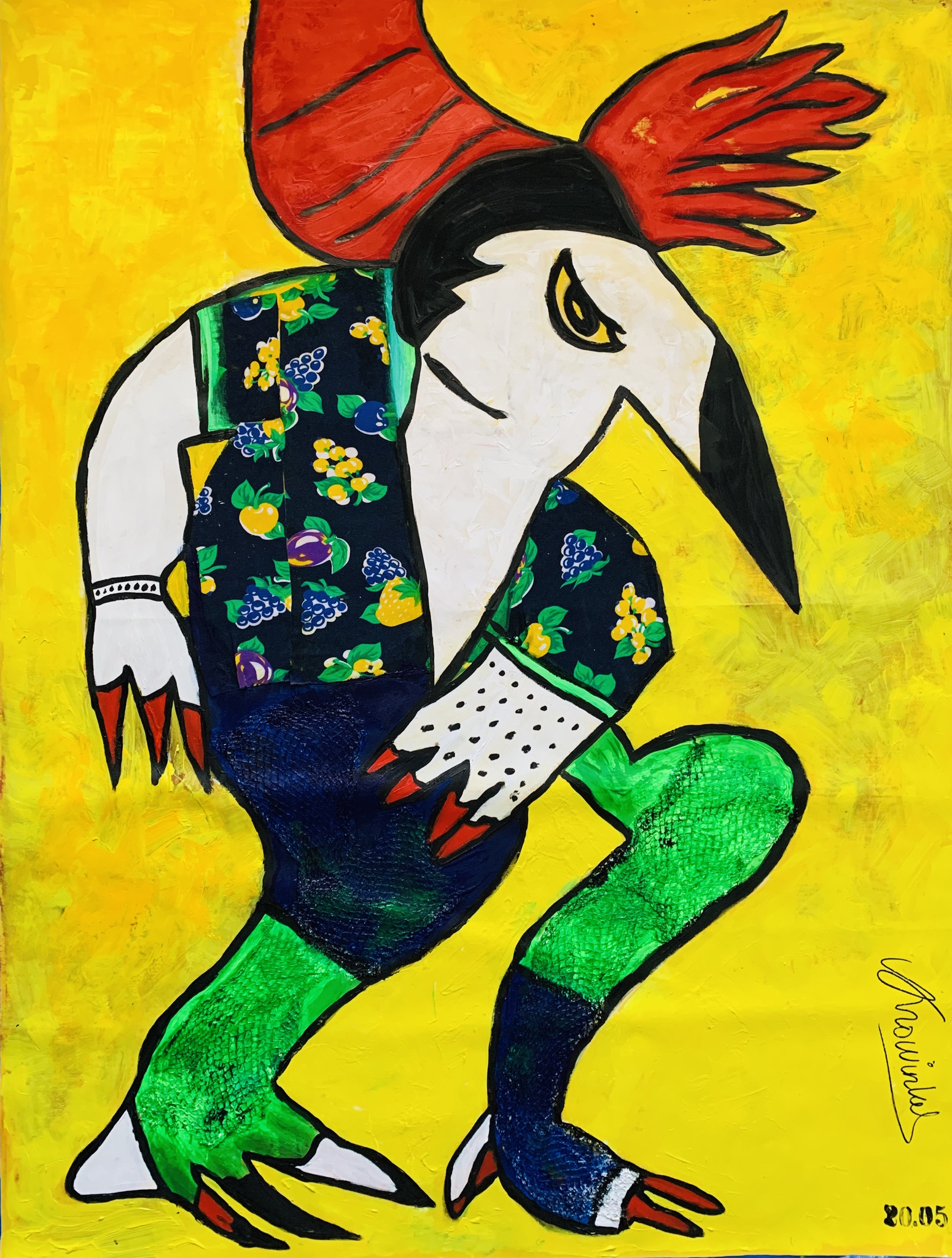 Een kwade duivel uit Japan, hij ontstond tijdens het schilderen. Geen idee waar de kwaadheid vandaan komt. Hij is gelukkig ongevaarlijk. Als wandkleed op te hangen.