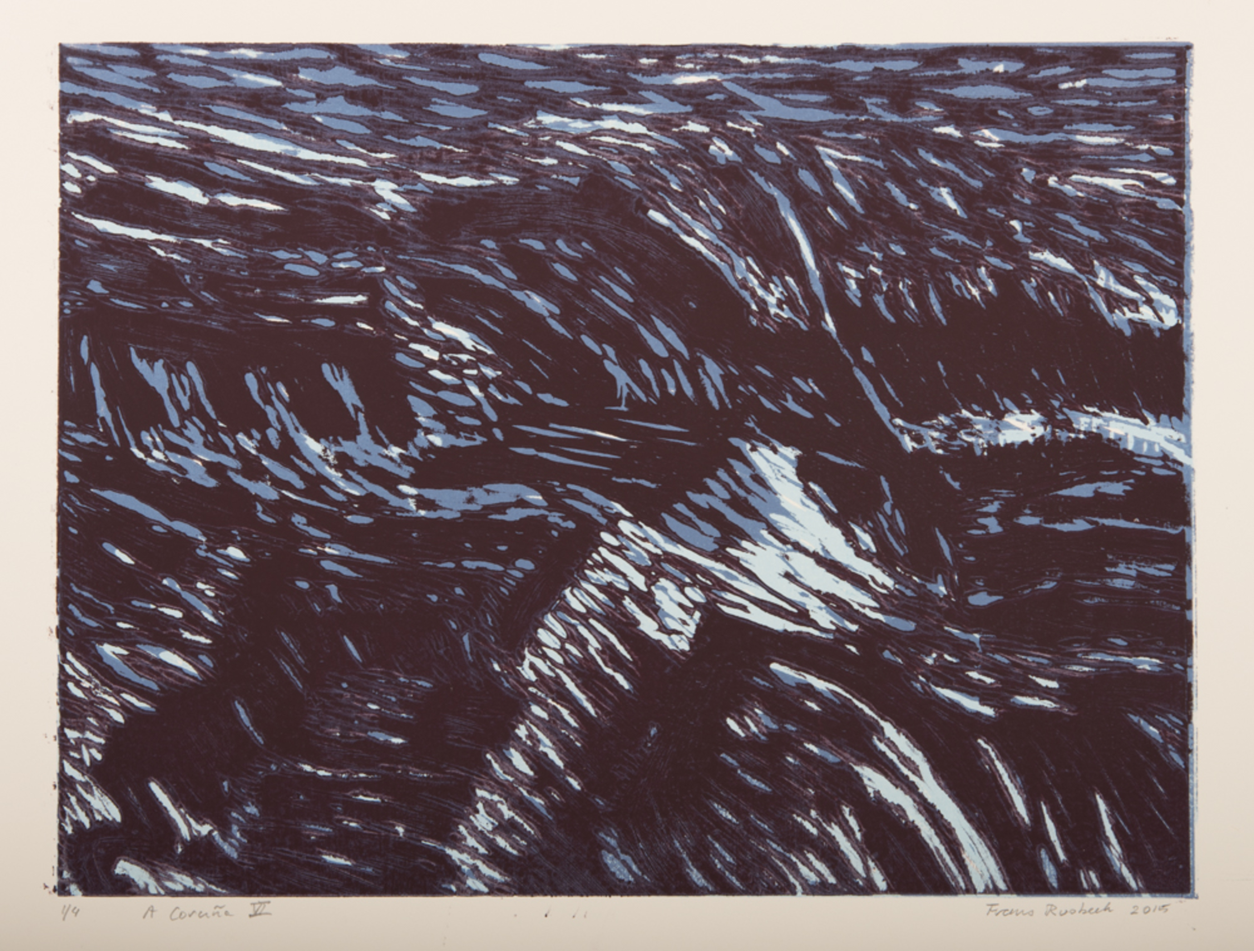 Het water stroomt over de rotsen bij A Coruña. In diverse kleurstellingen gemaakt omdat de aanblik sterk afhankelijk is van het weer, het licht. Techniek: houtsnede.