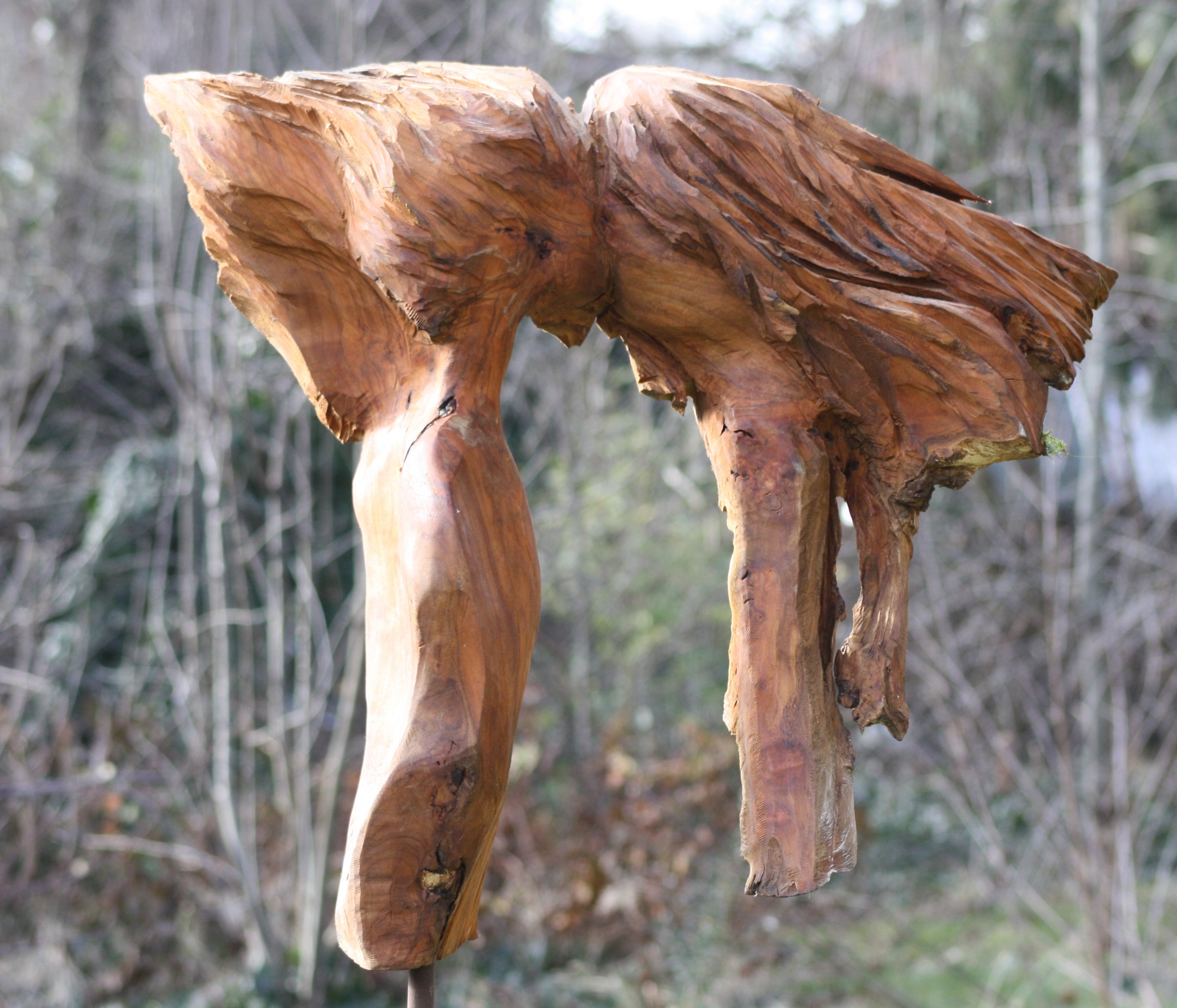 Aan de voorkant twee kussende meisjes, aan de achterkant twee vogels in elkaar overvloeiend, samen uit één stuk notenhout.