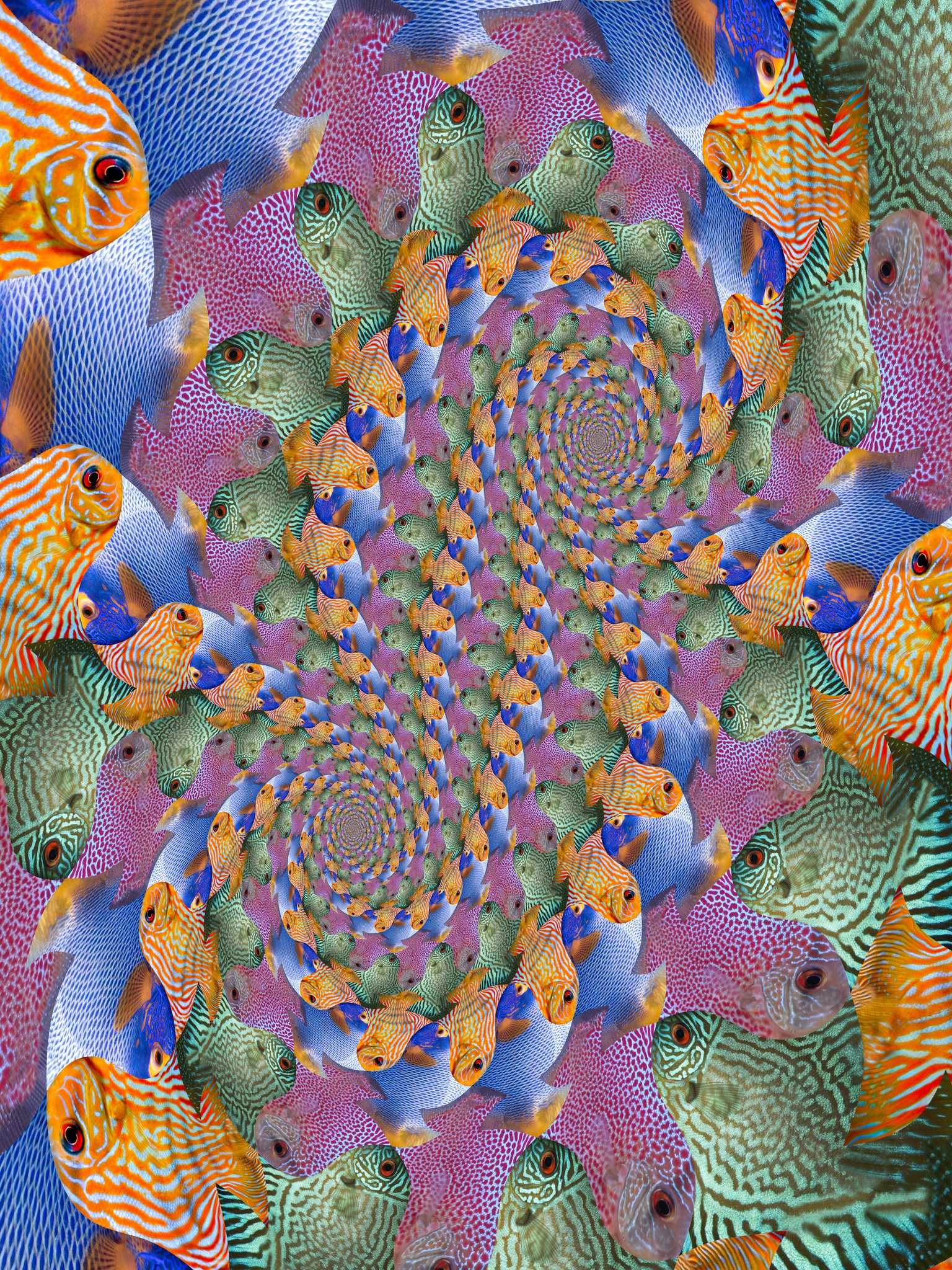 Langs 8 loxodromen zwemmen de oranje en roze vissen van noordpool naar zuidpool. De blauwe en groene vissen ertussen zwemmen in tegengestelde richting. Samen vullen de vissen het gehele vlak. Door de verschillende kleuren zie je de loxodromen niet meer, vergelijk met het werk "Loxodromen van Oranje en Blauwe Vissen" dat precies dezelfde structuur heeft. Wel zie je nu andere patronen van vissen met dezelfde kleur. Dit werk wordt afgedrukt als gallery-bond (tussen acrylglas en aluminium). Gelieve contact opnemen voor alternatieven.