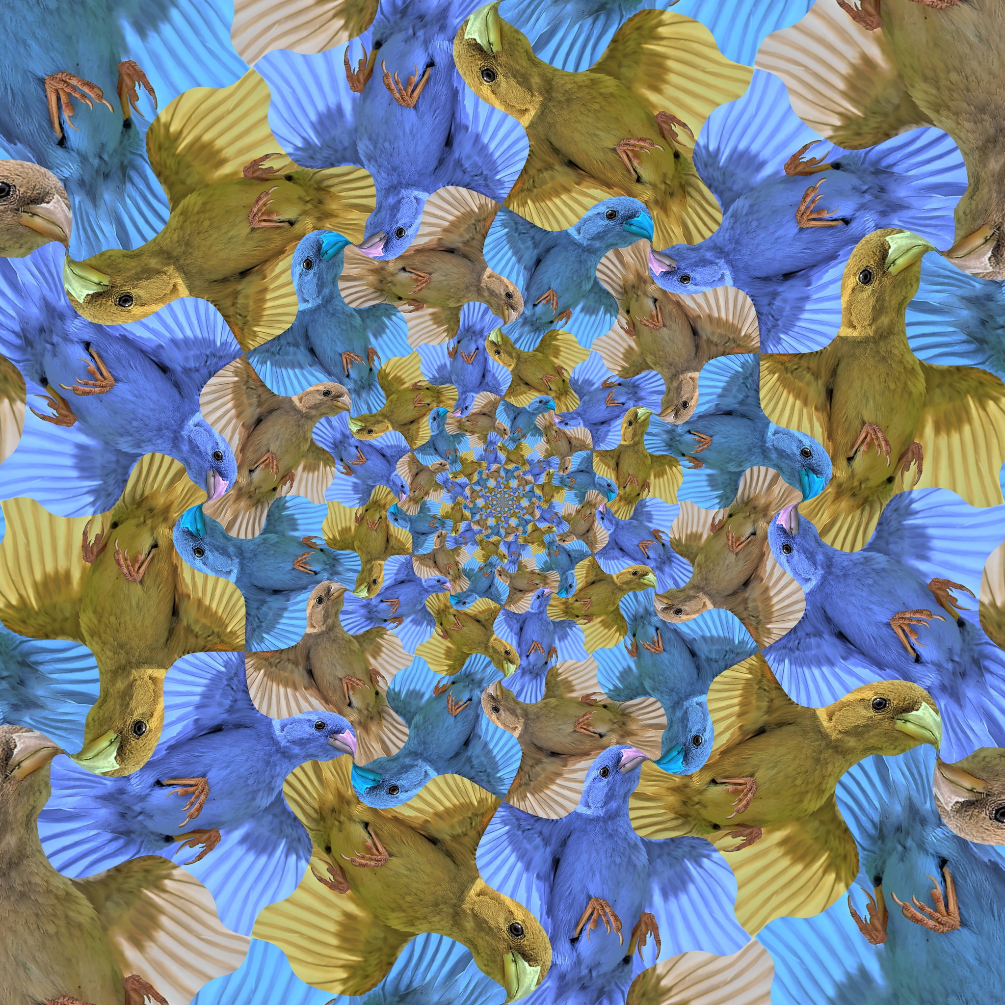 De inspiratie voor deze spiraliserende vlakvulling komt van M.C. Escher's Levensweg III (Path of Life ). De vogels lijken langs logaritmische spiralen heen en weer te vliegen naar het middelpunt. En toch is de afbeelding "gewoon" een fractal van cirkels. Dit werk wordt afgedrukt als gallery-bond (tussen acrylglas en aluminium). Gelieve contact opnemen voor alternatieven.