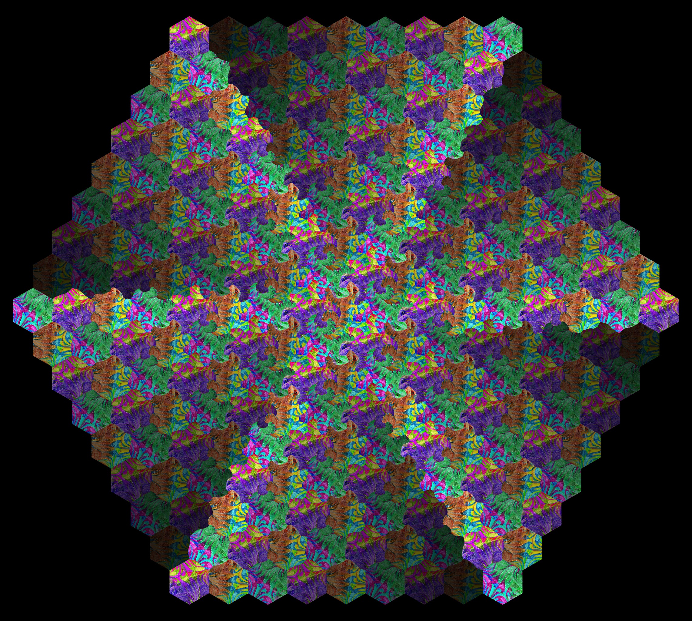 M.C. Escher's Metamorphose is de inspiratie voor deze vlakvulling. De drie hagedissen in het midden vervormen geleidelijk in zeshoeken. Alle oorspronkelijke kleuren van een hagedis komen in de zeshoek weer terug. Dit werk wordt afgedrukt als gallery-bond (tussen acrylglas en aluminium). Gelieve contact opnemen voor alternatieven.