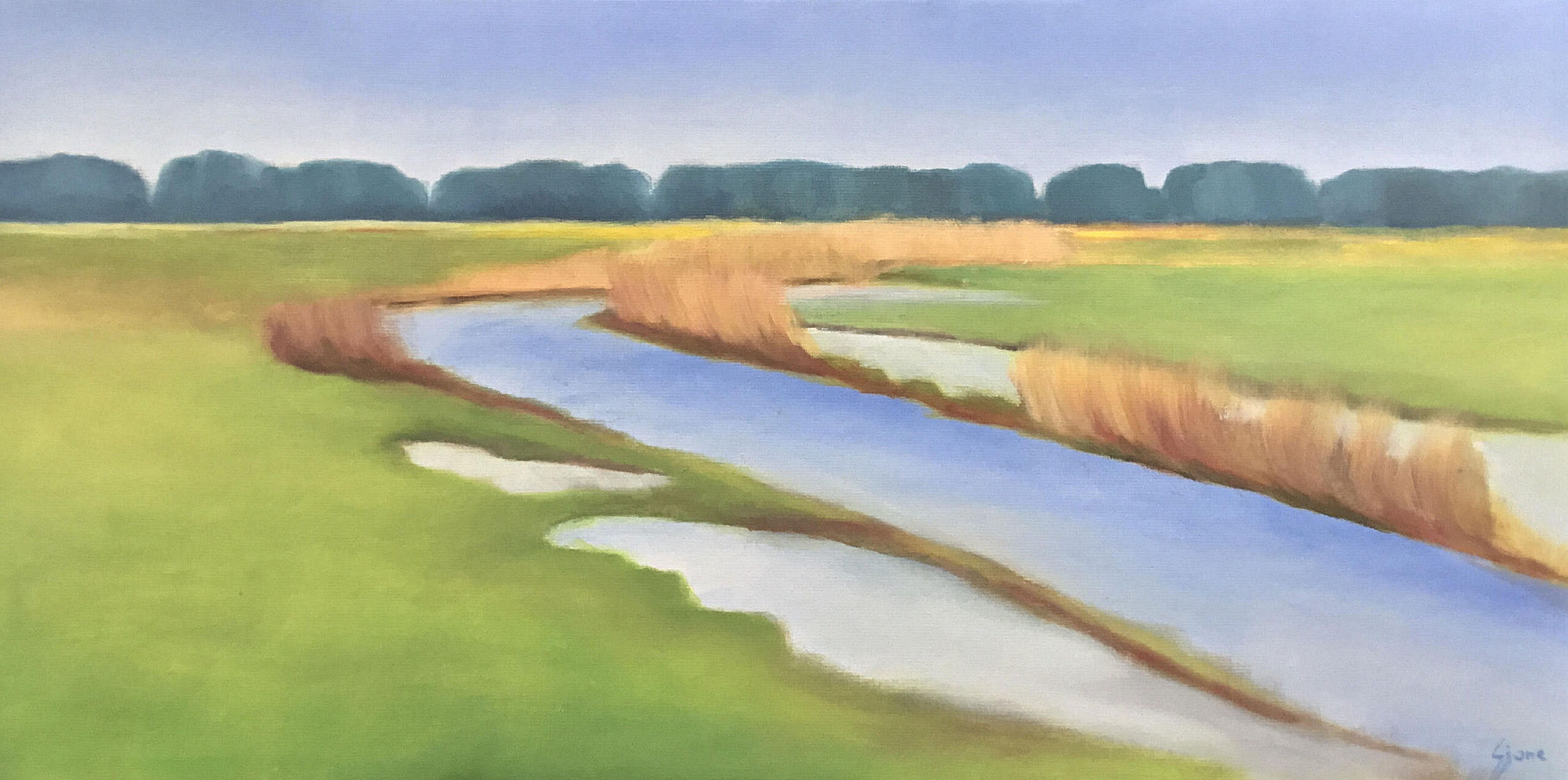 Het landschap is mijn grootste inspiratiebron. In de zomer heb ik veel buiten geschilderd. Mijn landschappen zijn kleurrijk en sterk geabstraheerd. Op het moment zijn mijn landschappen abstract.