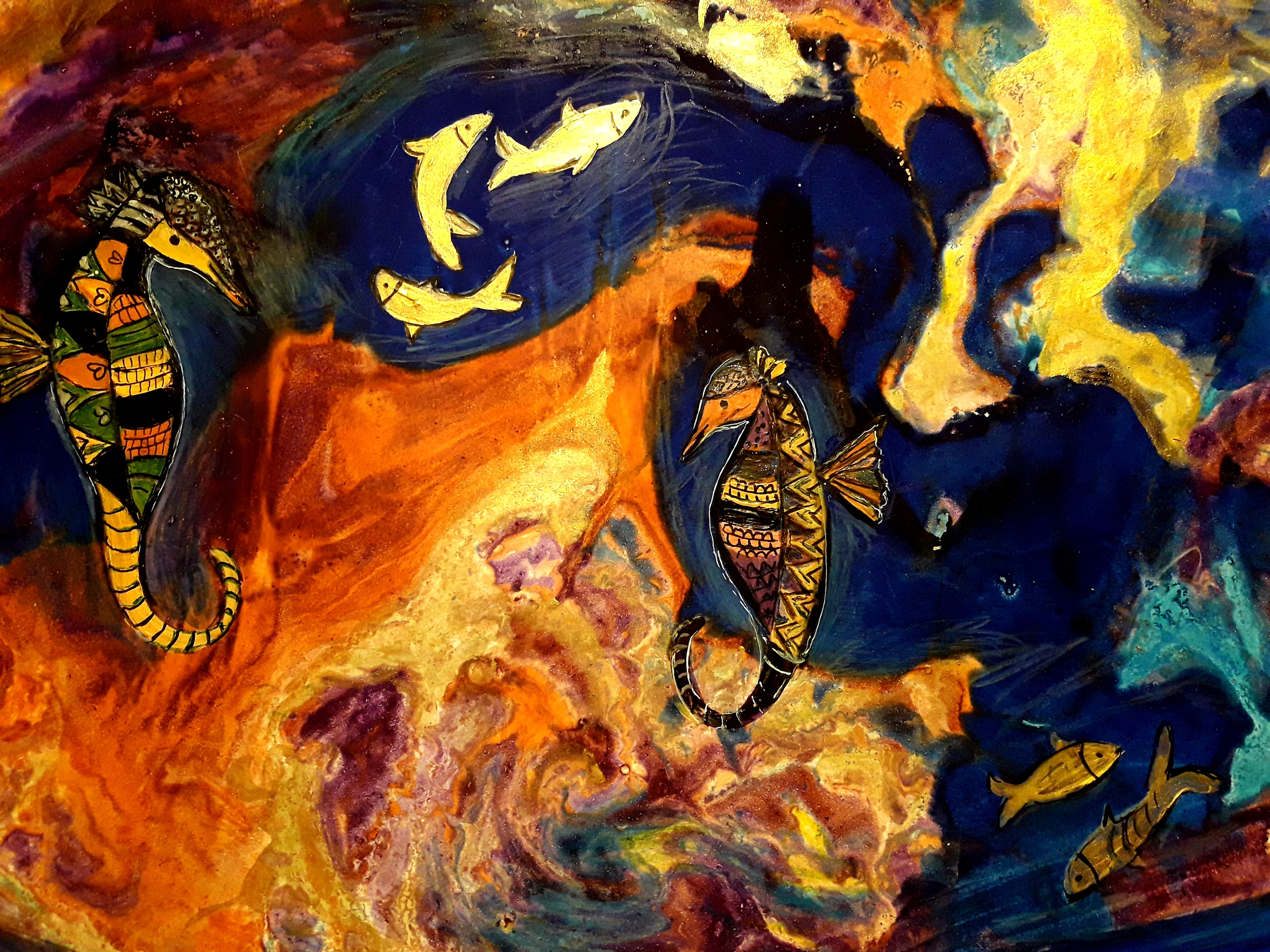 Mixed Media Oil Acrylic On Paper Nature Color Pencils Seahorses Fantastic