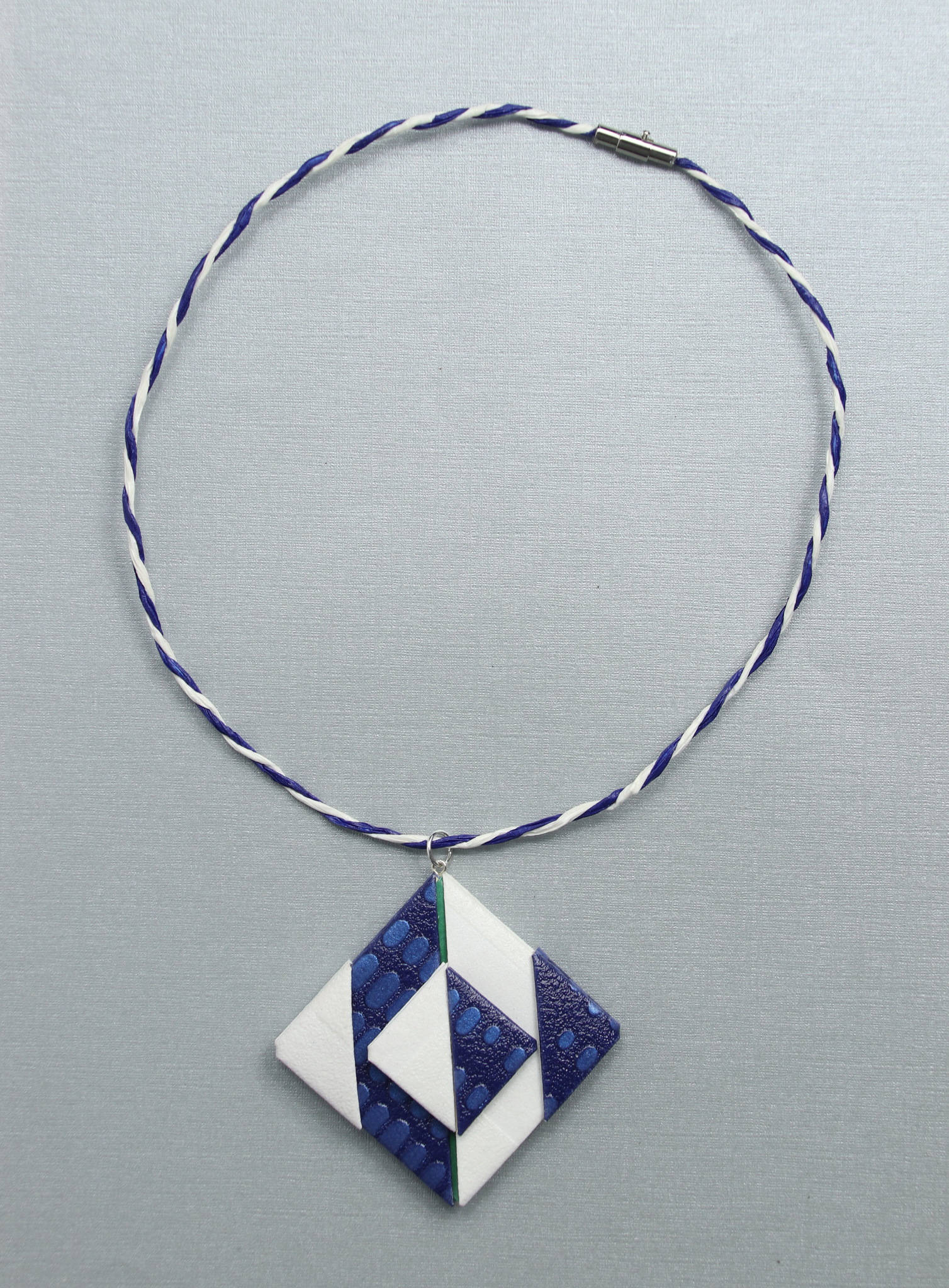 Orgami gevouwen papier met papiergaren afgewerkte ketting. Acryllak zorgt ervoor dat het sieraad waterbestendig is.