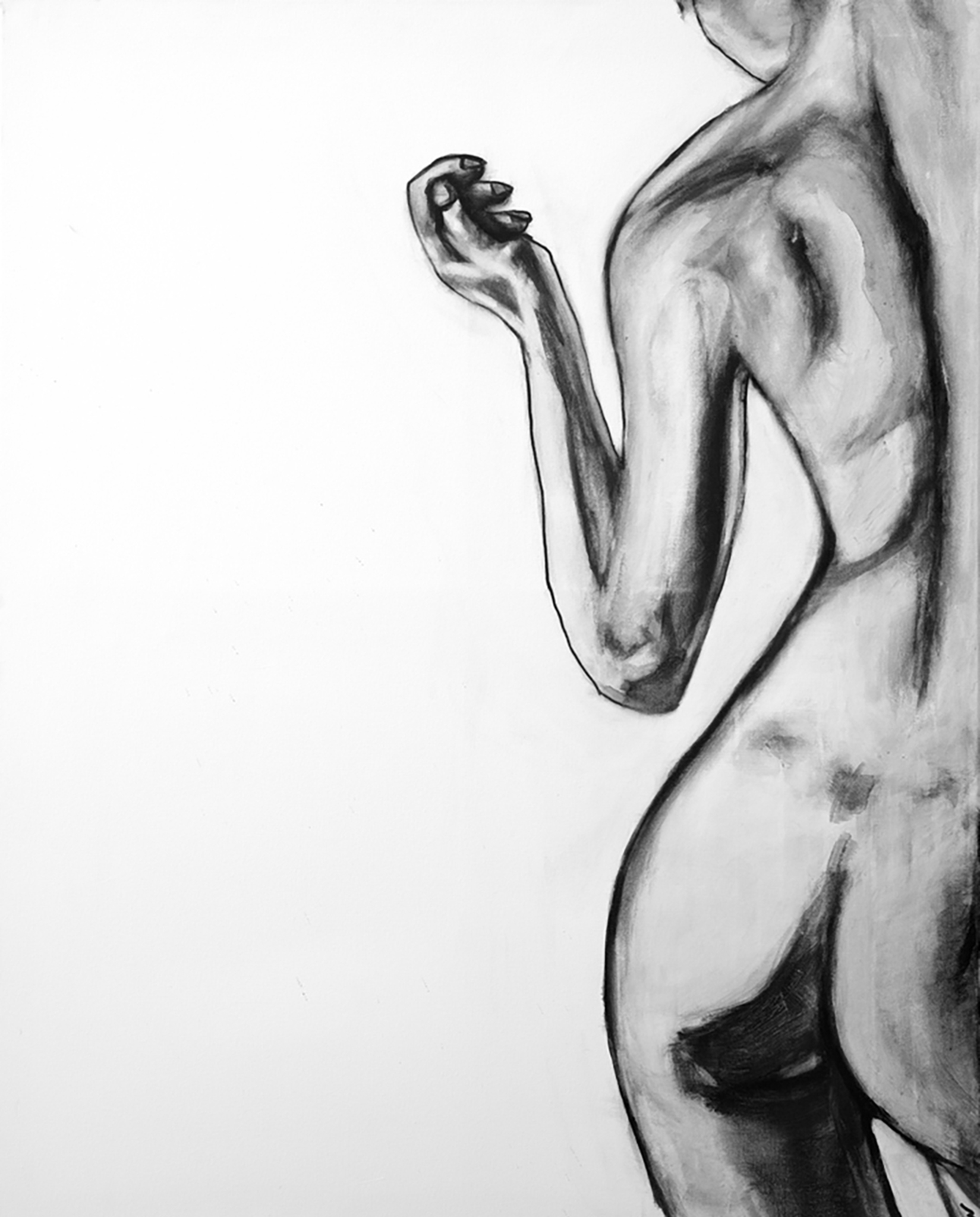 Zoekt in het harde zwart wit gebruik naar het zachte, ronde, vleselijke van de vrouw. Ingelijst.