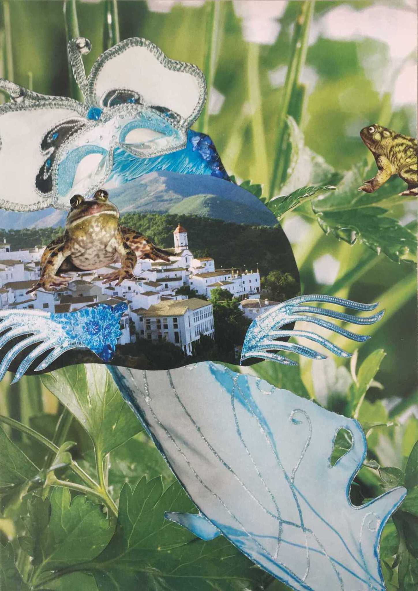 Surreeel Blauw Spiritueel Groen Kleurig Papier Vleugels Vlinder Kikker Flow Verhalend Zilver Collage Papierkunst Spiegel Positief Intuïtief Masker Artiest Kunstenaar Verhaal Bewegend Lijm Boodschap Schaar