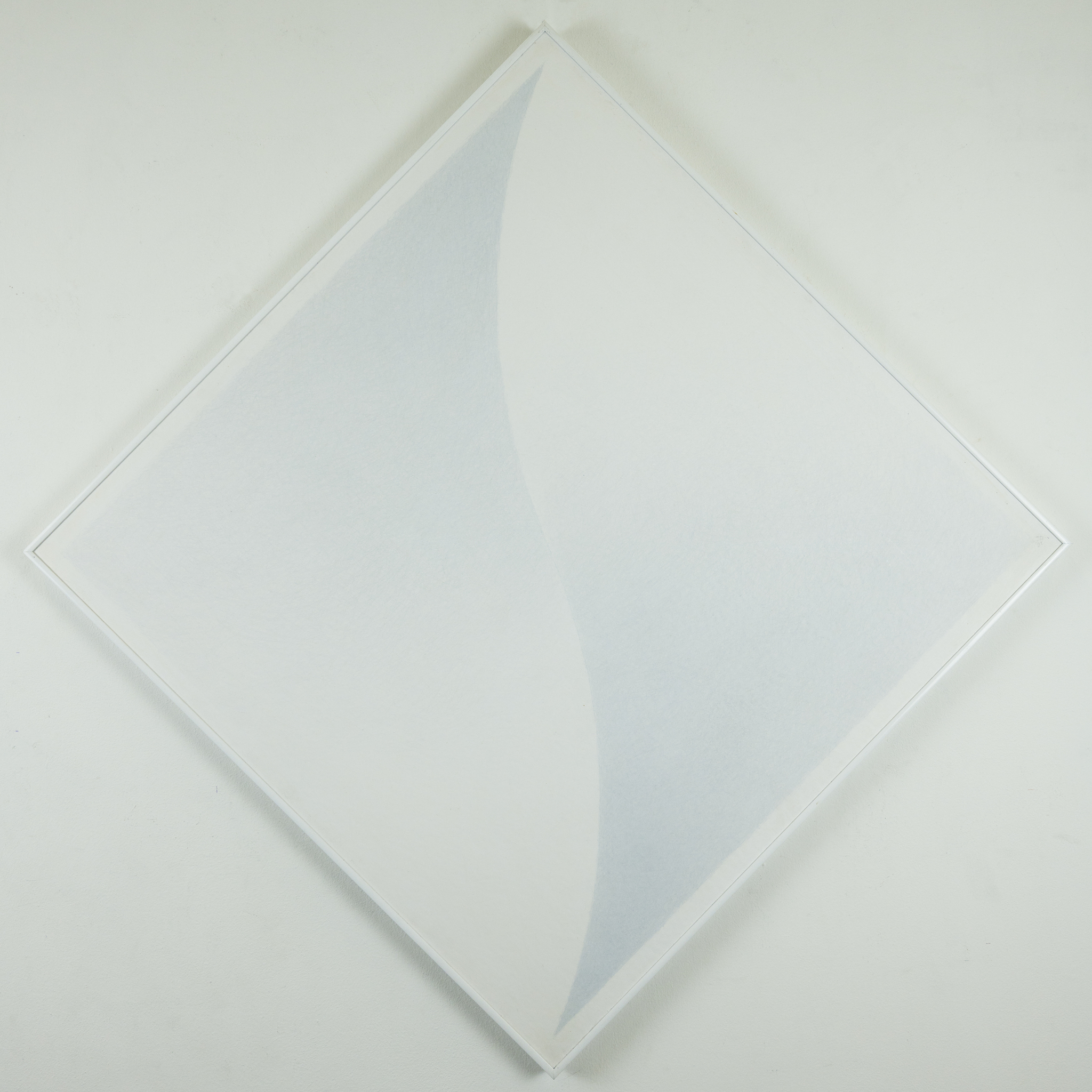 Geometrisch werk met potlood op papier. Werk is ingelijst in alluminium lijst zonder glas. Werk is beschermd door vernis.Vierkant is 70x70cm.