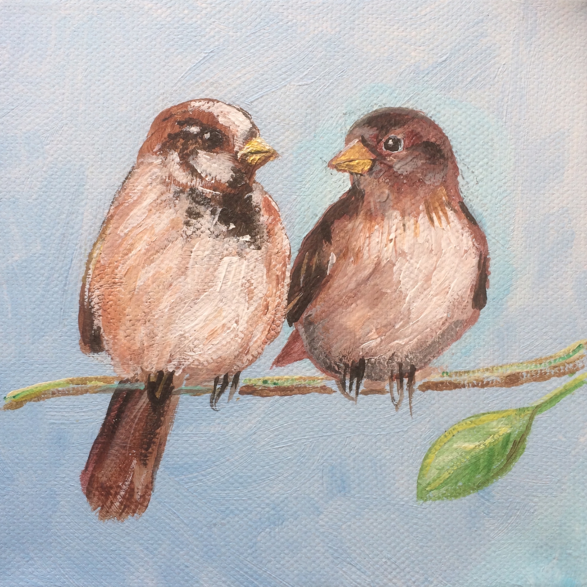 Dit werk is in opdracht gemaakt. De opdrachtgever wilde bij gelegenheid van een 40-jarig huwelijksjubileum graag een mussenpaar geschilderd zien.