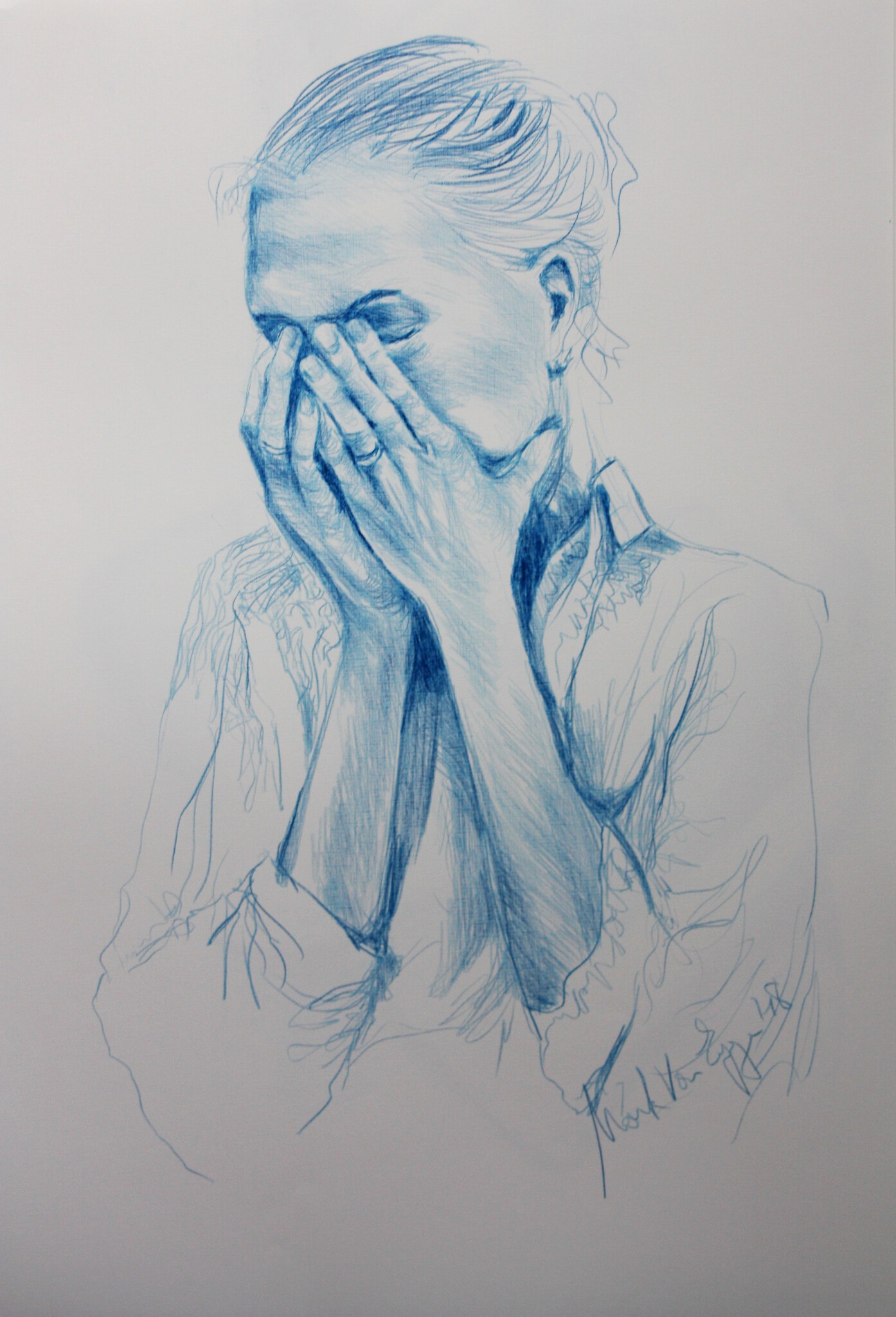 Portret in blauw potlood van een treurende vrouw, groot formaat