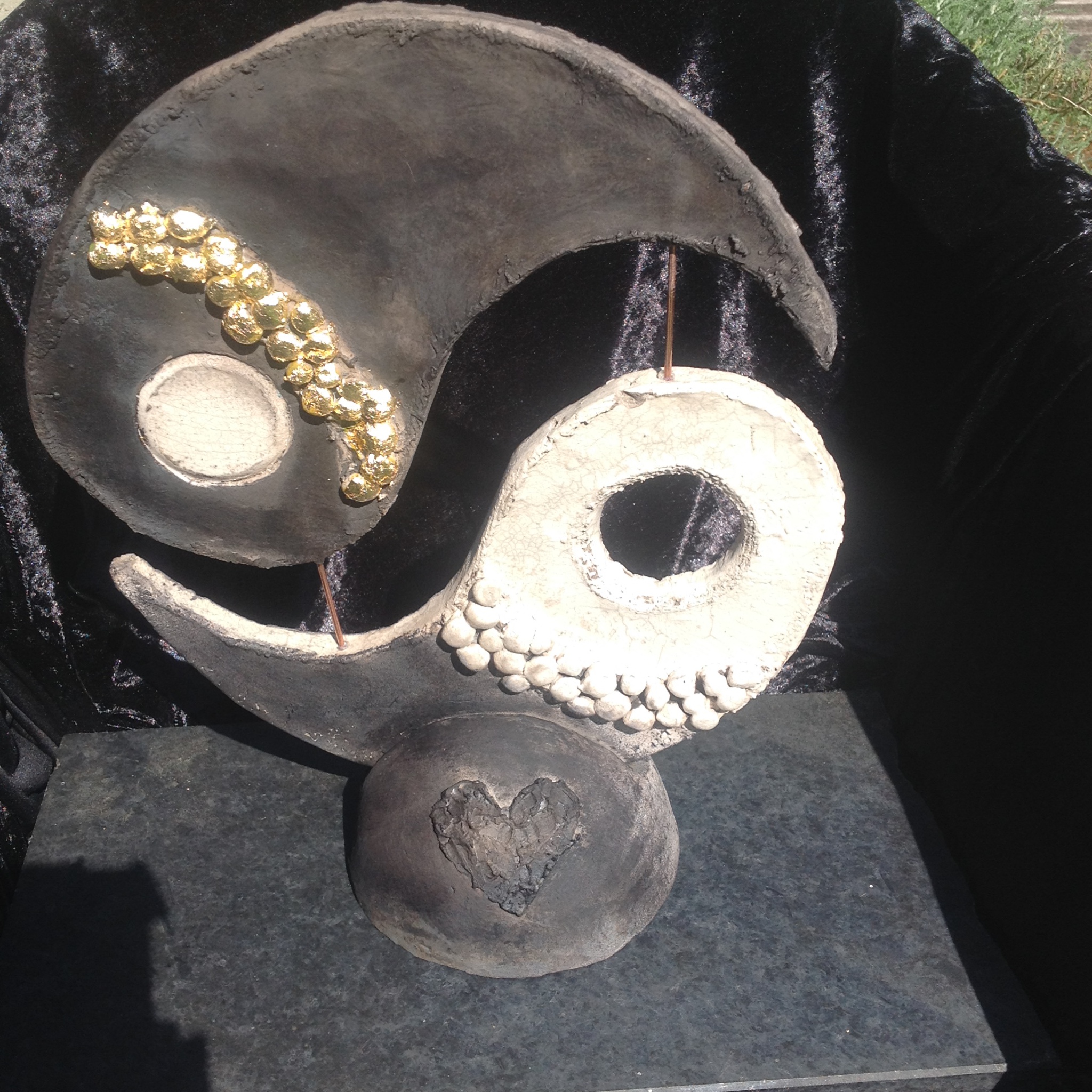 Het Chinese teken, Ying-Yang staat voor evenwicht en dualiteit ying is vrouwelijk en Yang is mannelijk. Deze is met bladgoud en Raku gestookt.