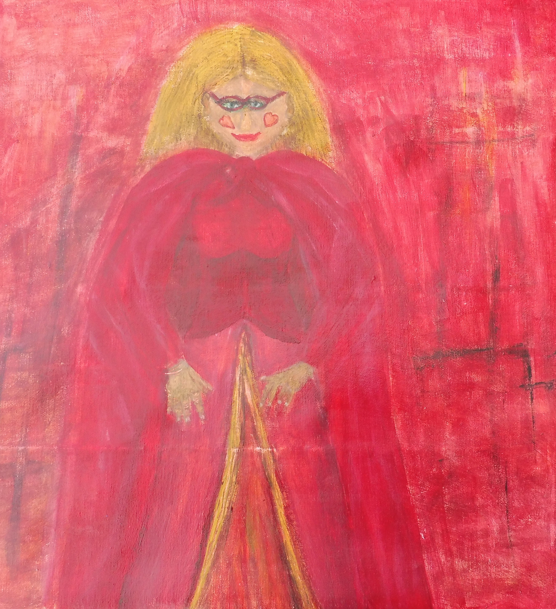 Met restanten van schuttinghout en sterk canvas maak ik zelf een schilderdoek. Een paar dagen later geef ik me over aan de Heilige Geest en komt tot een krachtige vrouwspersoon. God zal een eind maken aan alle list en bedrog(Zefanja 1) en Hij zal Zijn gerechtigheid tot heerseres maken. Strek je ernaar uit.