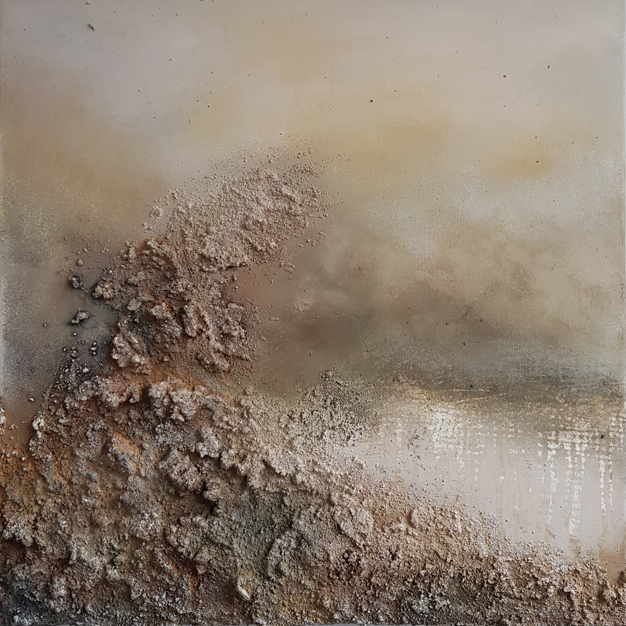 Middelgroot abstract landschap van 50 x 50 x 4,5 cm. Gebruik gemaakt van gemengde techniek. Intuïtief ontstaan. Op het doek zit een grove textuur. Geschilderd met acrylverf. Voor meer foto's kunt u terecht op www.reneetencate.nl