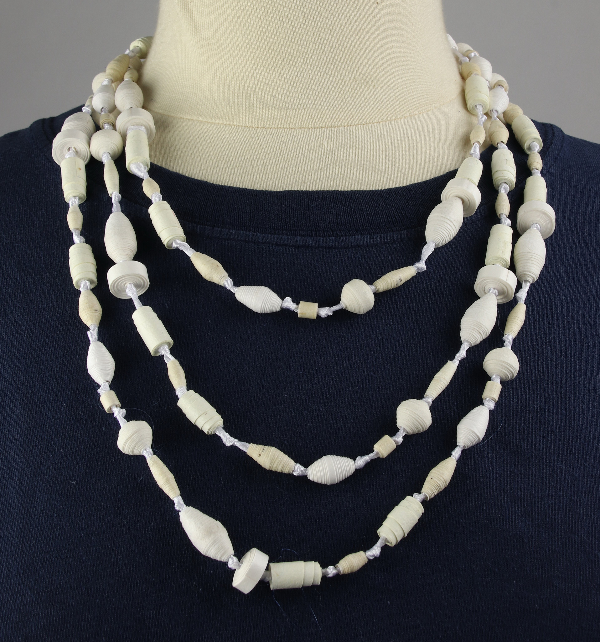 Papier kralen van handgeschept papier met zijdelint. Afgewerkt met acryllak.