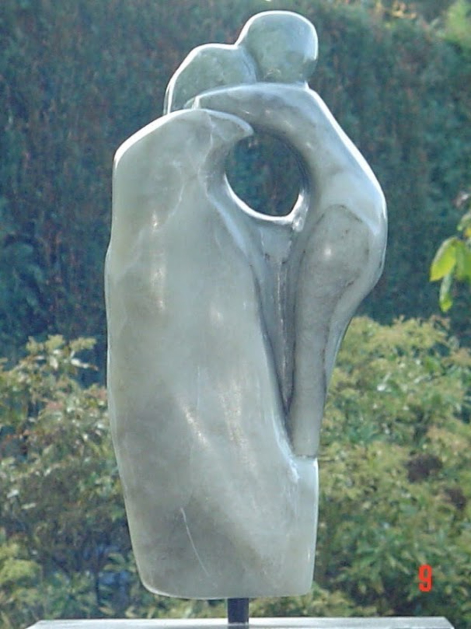 Geschikt voor plaatsing binnen De basisvorm van dit beeld is puur intuitief ontstaan. Lange tijd heeft het in de vitrine gelegen voor ""nog verder te bewerken beelden"". Op een gegeven moment ontdekte ik in de basisvorm de 2 figuren. Verdere bewerking liep uit op de generatietrap zoals hier afgebeeld.