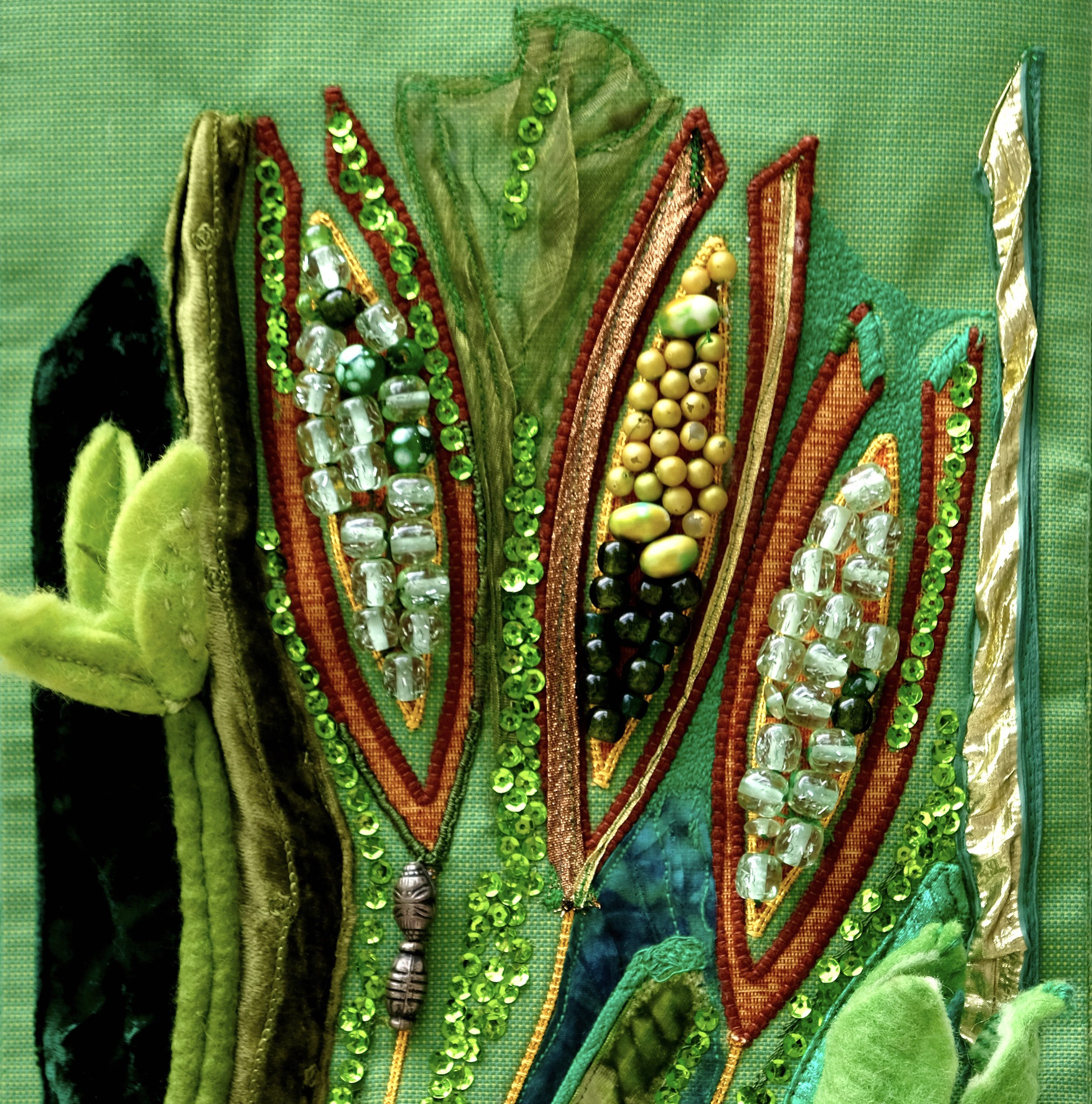 Dubbele kaart (15x15 cm met envelope) van groen antependium. Groei van het graan