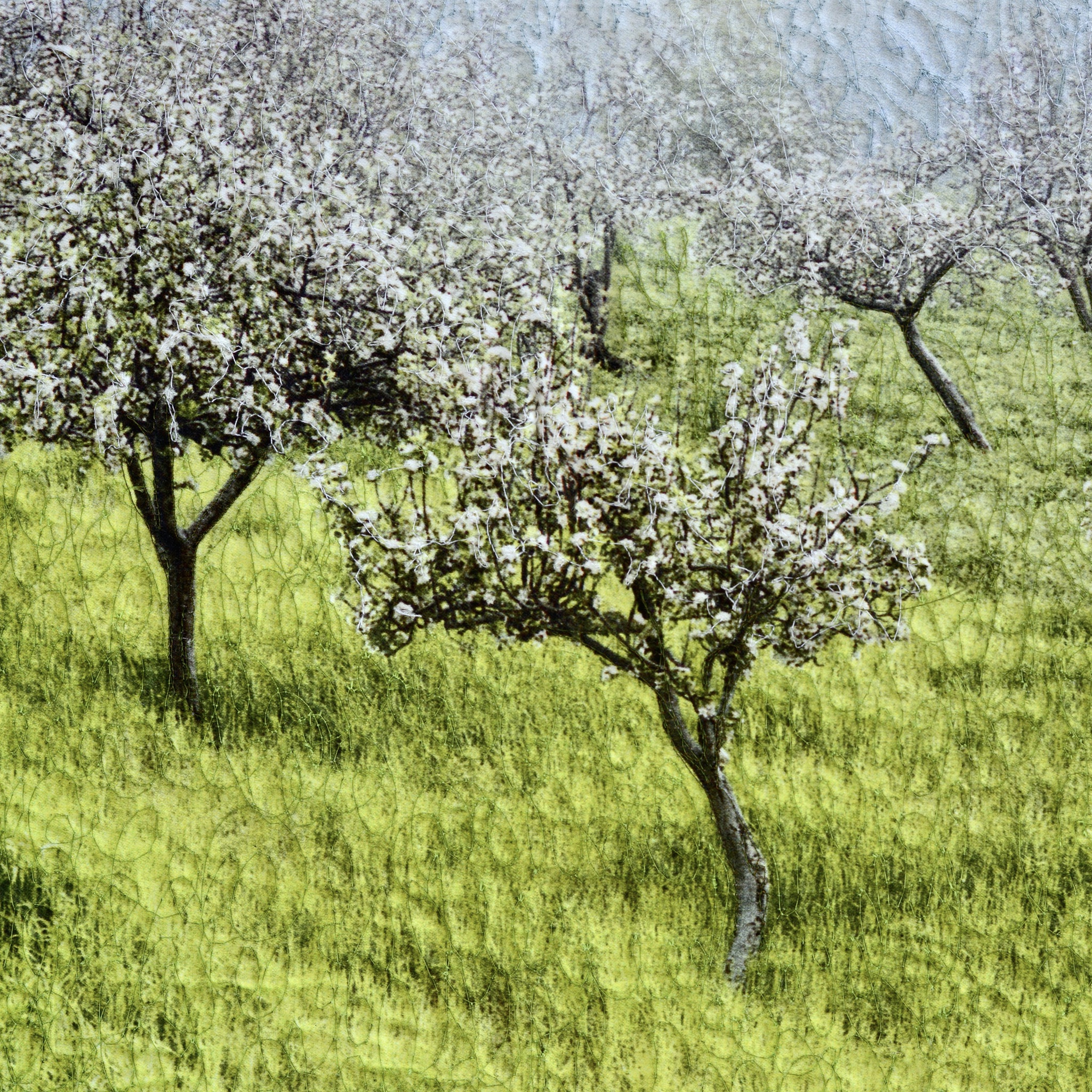 Dubbele kaart (15x15 cm met envelope). Detail van textiel kunstwerk bloeiende amandelboompjes