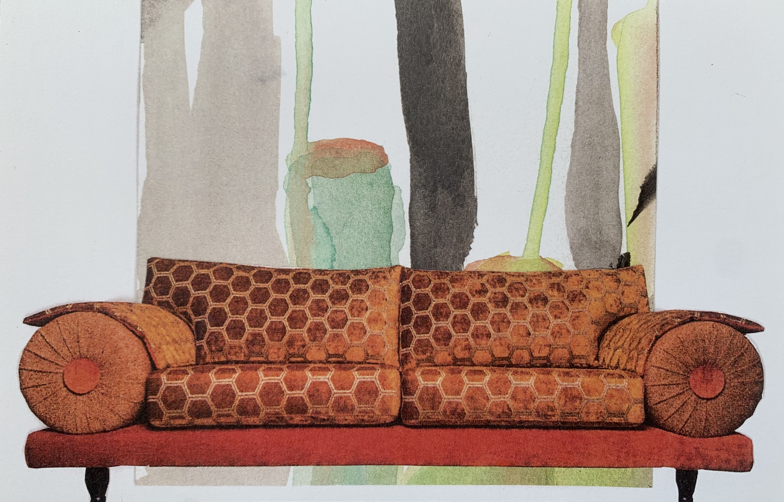 Gemengde technieken op papier. Collage en aquarel. Oranje en pastel.