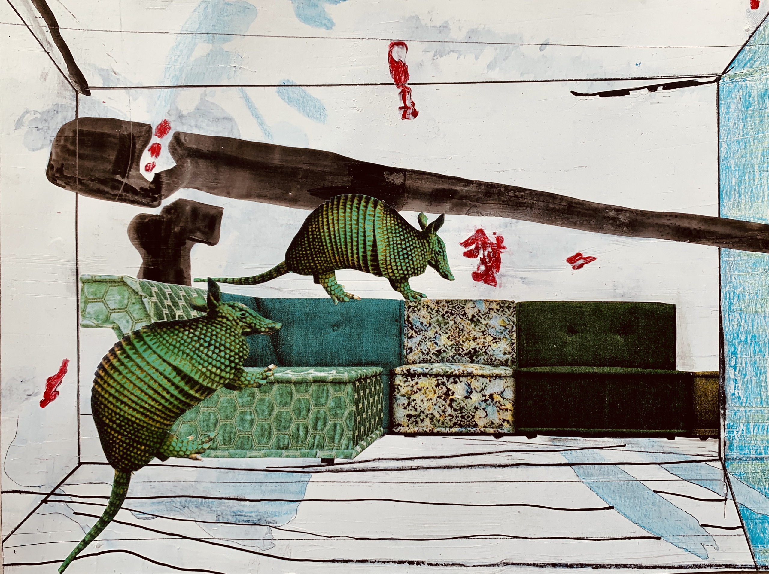 Gemengde technieken op papier. Collage, acrylverf, fineliner, inkt. Groen. Gordeldieren. VERKOCHT