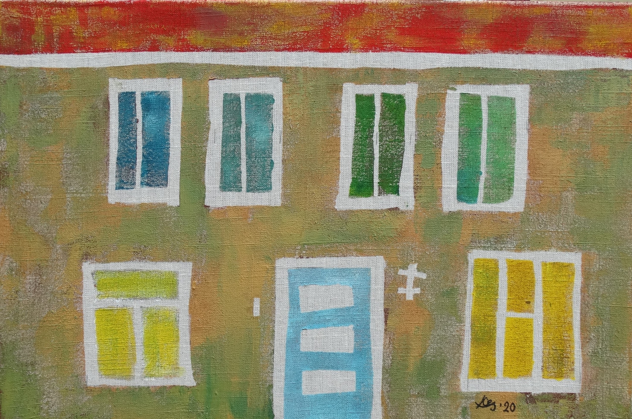 Voorgevel van mijn huis. Geschilderd op onbewerkt canvas waardoor het een ruwe uitstraling krijgt. Ook te bestellen van uw huis.