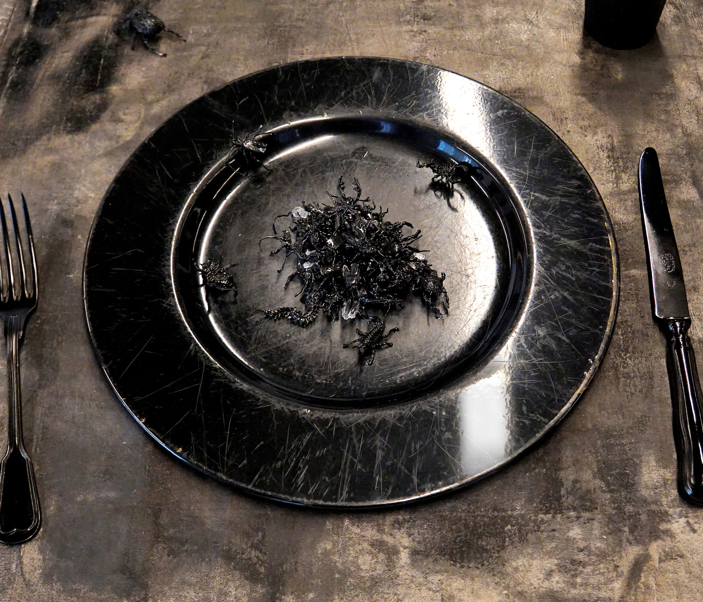 3D-pentekening (van insecten) en attributen. | Bekijk dit werk beter op vlvi.nl/delicatesse Terwijl we met een scheef oog kijken naar de Aziatische ‘extreme markets’, lopen wij ook in het westen aan tegen onze (ethische) voedselgrenzen. “Delicatesse” zoomt in op de -noodzakelijke- veranderingen binnen onze voedselketen. Insecten worden gezien als voedzame, duurzame oplossing. Ook is men ervan overtuigd dat ziektes die insecten bij zich dragen nooit op mensen zullen overgaan. Uiteraard zullen we in staat zijn de gedaante van de insecten in iets smakelijks te veranderen, voor ze op ons bord komen. Maar ook insecten zullen we in grote hoeveelheden moeten kweken, willen we iedereen blijvend kunnen voeden.