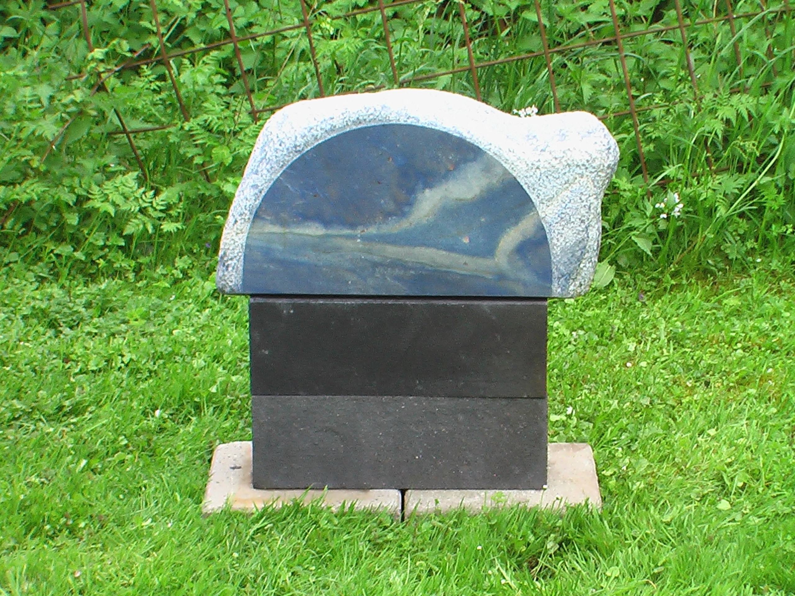 Abstract of Blauwe Hemel Materiaal: Azul de Macaubas - Braziliaans granietmarmer op betonnen sokkels - Gewicht: 50 kg Gemaakt in: Le Phaux, Auvergne, Frankrijk + Wenum, Nederland Opmerking: Een ongelooflijk harde steen om te bewerken! Er zijn cirkels in het beeld, in het gepolijste deel en in de vormen erachter, op de foto is dit wat lastiger te zien. De door de cirkels ontstane bollingen en hollingen geven het beeld spanning, wat nog versterkt wordt door de eigen wolk-achtige tekening van de steen, die in het gepolijste deel zichtbaar is. Als deze steen nat wordt, is de blauwe kleur nog intenser. Abstract or Blue Sky Materiaal: Azul de Macaubas - Brazilian granitemarble on concrete socles - weight:50 kg Made in: Le Phaux, Auvergne, Frankrijk + Wenum, Nederland Notice: An unbelievable hard stone to work on! Circles are made in the image, in the polished part and in the shapes behind it, in the photo this is more difficult to see. The bulges and hollows created by the circles give the image tension, which is further enhanced by the stone's own cloud-like drawing, which is visible in the polished part. When this stone gets wet, the blue color is even more intense.