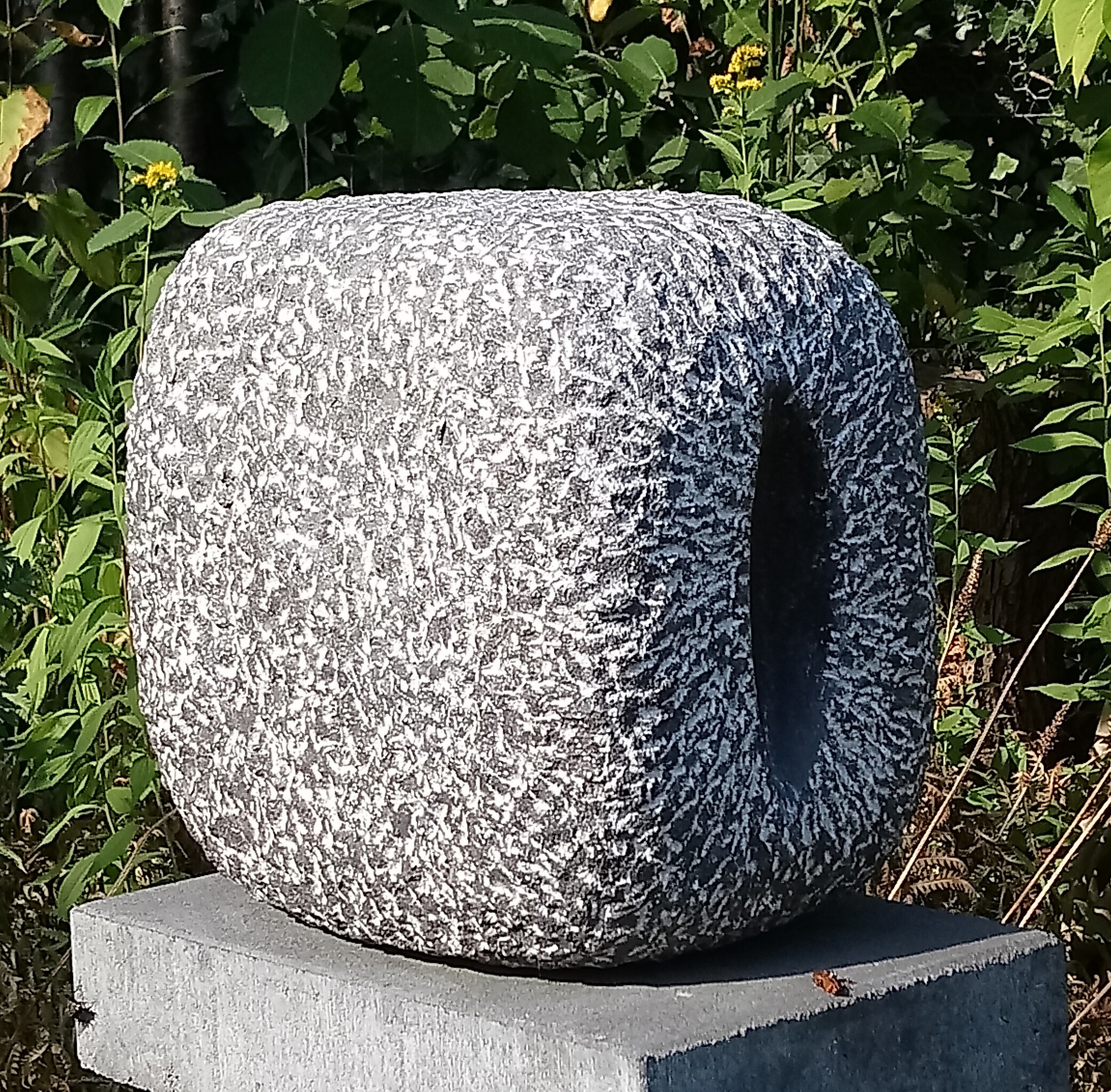 Abstract met oog Materiaal: Belgische Hardsteen Noir de Mazy op sokkel - Gewicht : 28 kg + 24 kg Gemaakt in: Wenum Wiesel, 2017-2018 Opmerkingen: afm. betonnen sokkel 55 x 15 x 15 cm, gewicht 24 kg. De inspiratie voor deze vorm ontstond, doordat ik graag 2 structuren in deze steen wilde laten zien. In het gepolijste deel zie je de lagen en kristallen in de steen. Door de hardheid van deze steen moeten de vormen heel eenvoudig blijven. Daardoor heeft dit beeld een abstractere vorm gekregen. De symboliek in dit beeld verbeeldt een oog of spleet of doorgang naar een andere werkelijkheid. Vormgeving en inspiratie werken door elkaar heen in het beeld. Beide ontstonden gaandeweg tijdens het maken. Abstract with eye Material: Belgian Hardstone Noir de Mazy on socle Sizes: - height: 70 cm - width: 18 cm - length: 24 cm - weight: 28 kg + 24 kg Made in: Wenum Wiesel, 2017-2018 Notice: size of concrete socle55 x 15 x 15 cm, weight 24 kg. The inspiration for this shape came about, because I wanted to show 2 structures in this stone. In the polished part you can see the layers and crystals in the stone. Due to the hardness of this stone, the shapes must remain very simple. As a result, this sculpture has acquired a more abstract form. The symbolism in this sculpture represents an eye or slit or passage to another reality. Design and inspiration work together in the sculpture. Both arose during the making process.