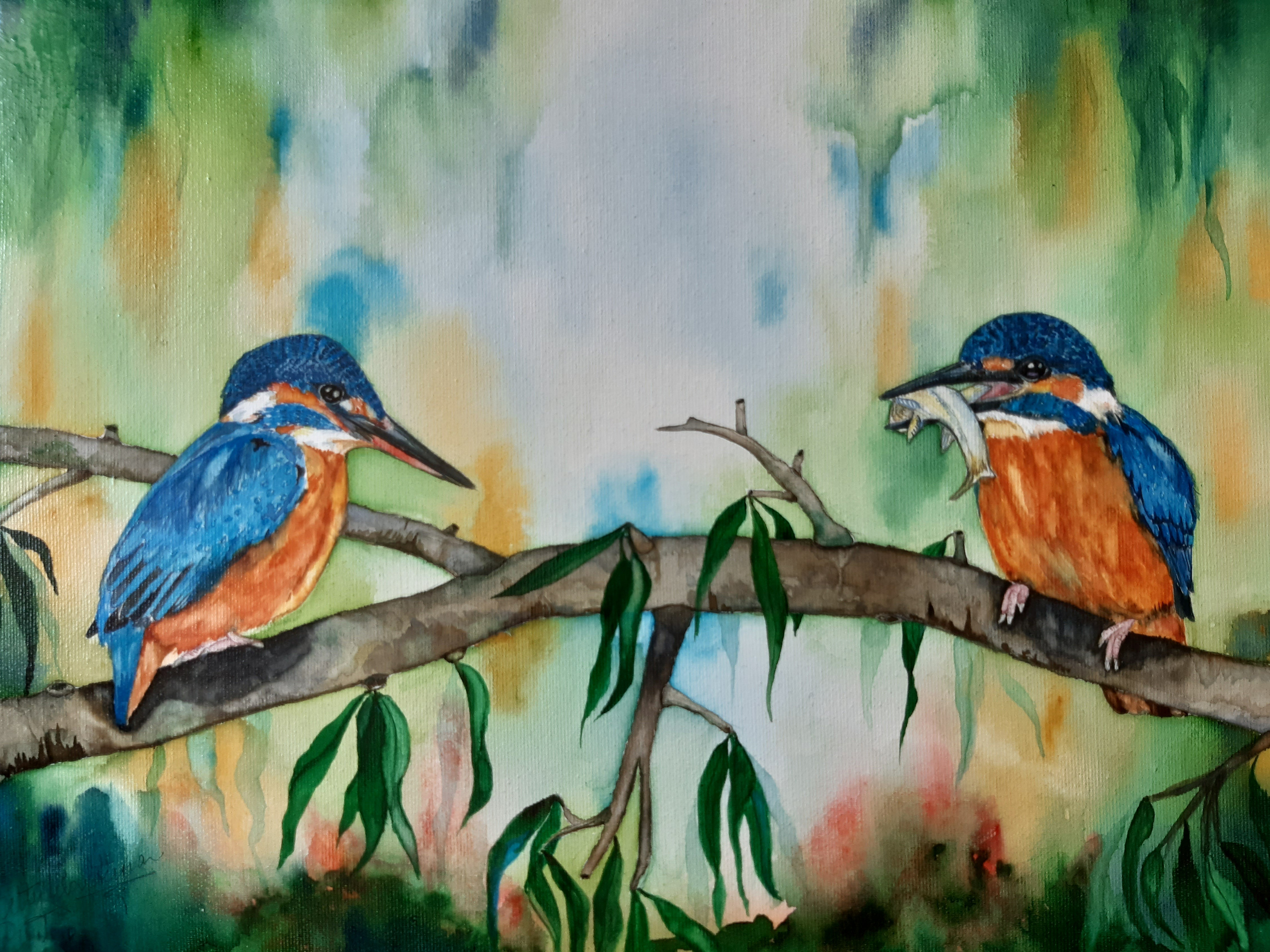 "Dinner" 2 ijsvogeltjes waarvan er eentje eten komt brengen. Veelklerurige achtergrond. Aquarel door een speciale techniek op doek geschilderd. Aangezien er geen glas voor zit is het in meerdere lagen afgelakt en aan de achterkant voorzien van een staaldraadje zodat hij direct op te hangen is.
