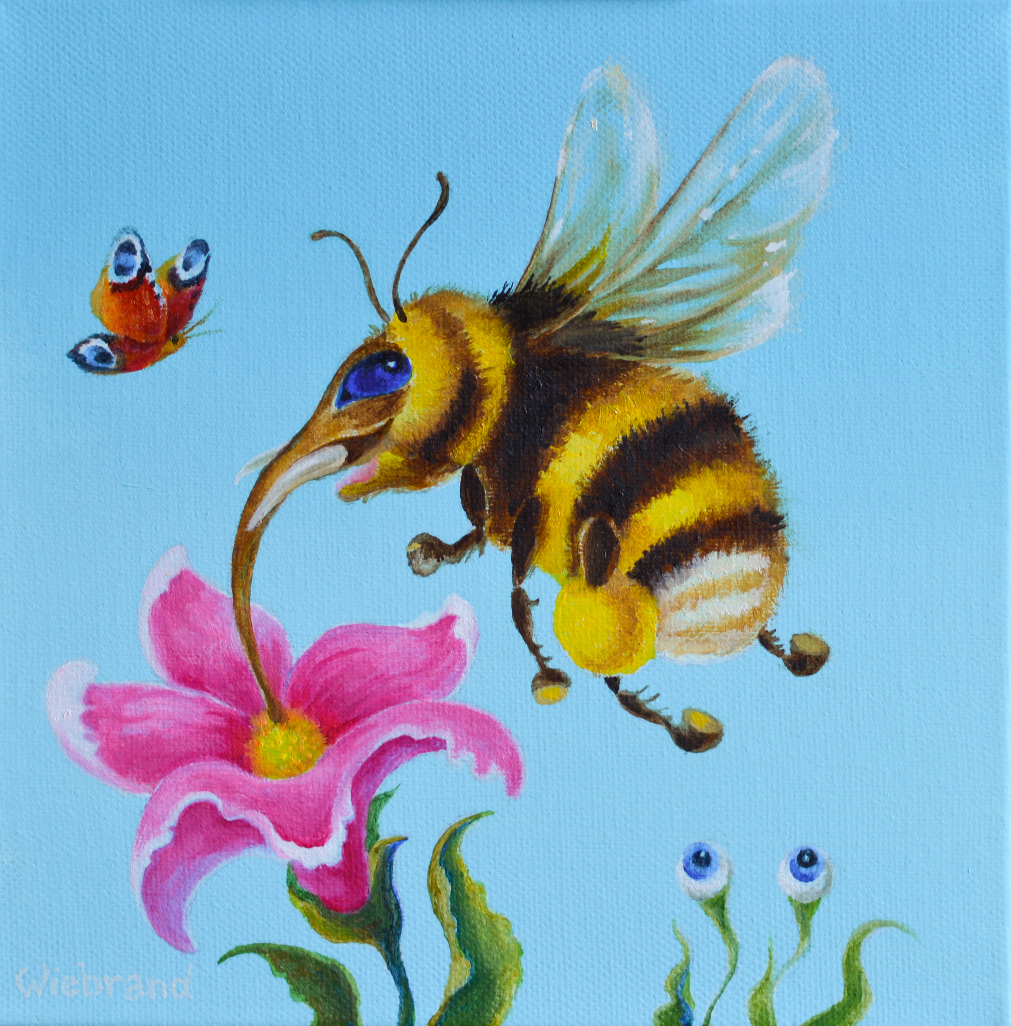 Hommels, vlinders, portretten, uitbundig bloeiende bloemen en levenslust zijn bij mij terugkerende thema’s. Soms overheerst de sereniteit, terwijl andere werken een dynamische indruk achterlaten. De boodschap die ik tracht uit te dragen is: vier het leven! De bloemen en insecten zijn rijkelijk aanwezig in mijn eigen tuin en directe omgeving. Zo zijn er meertjes, graslanden en zelfs een klein bos dichtbij. Al deze schoonheid vraagt om aandacht en verdiend het om geschilderd te worden.