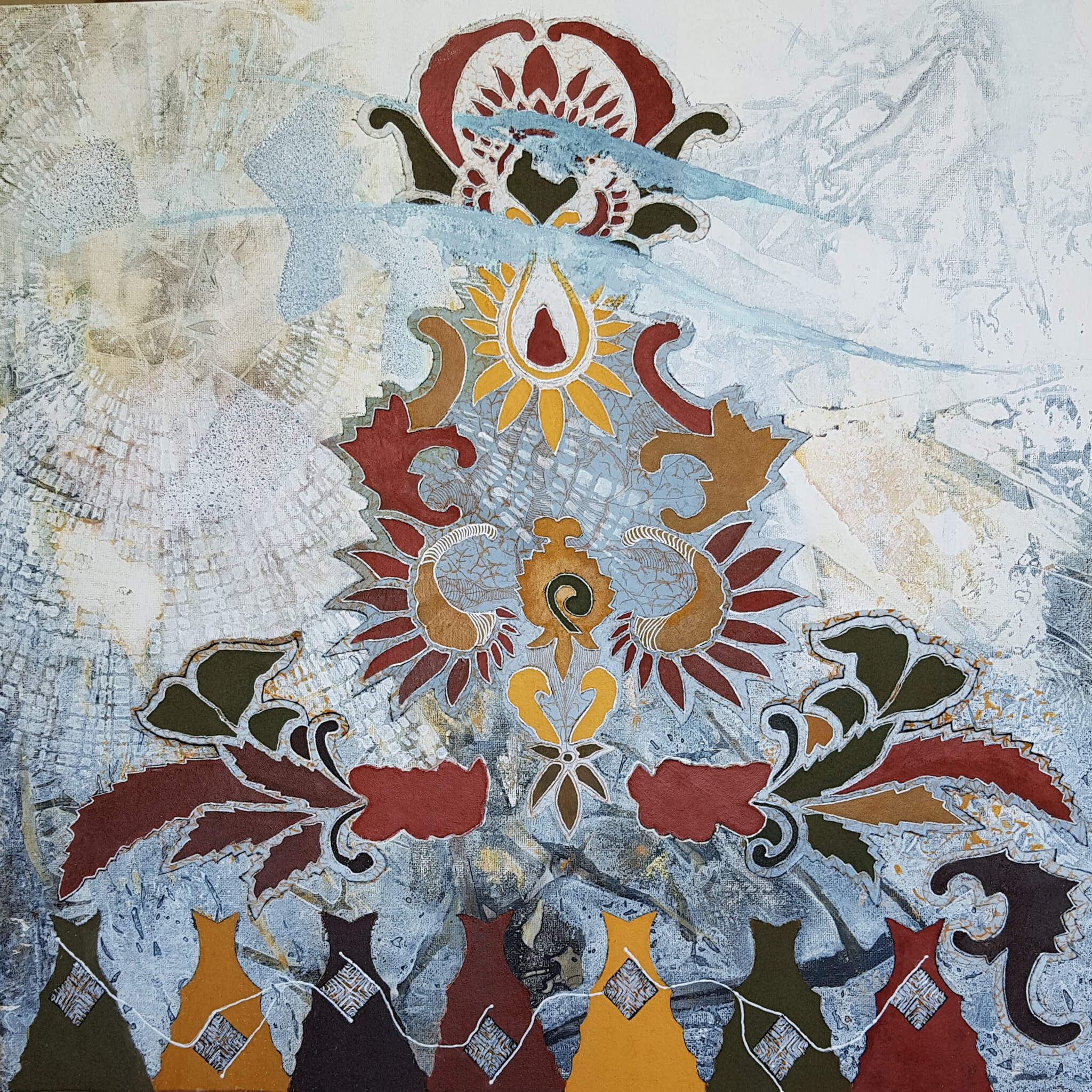 Werk op canvas met bewerkte textiel, wolkenslierten en zonnestralen. Onderdeel van 3-luik