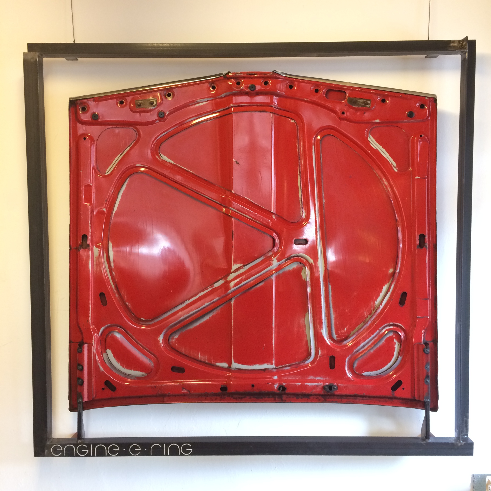 Car-Art: ‘Engine-e-ring’ Ingenieurs maken soms kunstwerken die voor velen onzichtbaar blijven. Een zo’n mooi kunstwerk is nu door mij wel duidelijk zichtbaar gemaakt. De onderkant van een motorkap is met veel zorg en preciesie van versterkend plaatwerk voorzien. Door de ronde vorm is de motorkap relatief licht en toch sterk, maar dit mooi werk is onzichtbaar wanneer de motorkap gesloten is. Staand plaatdeel in sterk metalen kader om als ‘blikvanger’ aan de muur te hangen