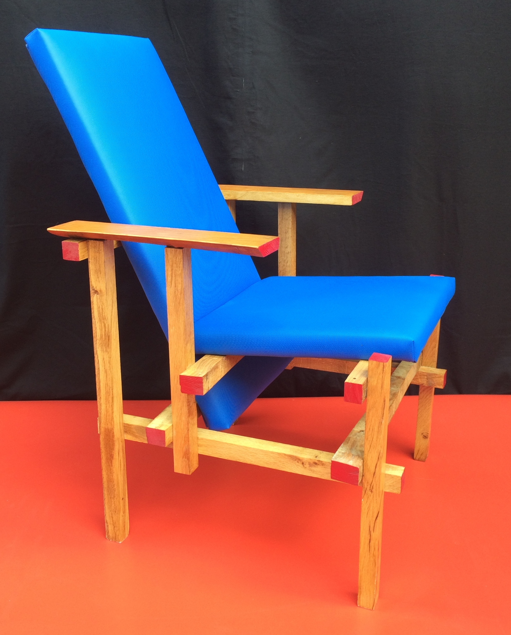 De Rood Blauwe Stoel in het originele ontwerp van begin twintigste eeuw is iconisch. Maar daarmee is het origineel ook al weer ruim 100 jaar oud en mist het in ieder geval één belangrijk aspect van een stoel; fijn zitten... Ik heb een eigen interpretatie, naar het ontwerp van Rietveld, van de Rood Blauwe Stoel gemaakt, met andere maatvoering en ander materiaalgebruik. De huidige mens is groter dan die van 100 jaar geleden: mijn Rood Blauwe Stoel is hoger en breder. Recycling van materiaal is nu een belangrijk aspect: mijn Rood Blauwe Stoel is gemaakt van hergebruikt eikenhout. En om langere tijd comfortabel te kunnen zitten zijn zitting en rugleuning bekleed. Resultaat: een gebruiksvriendelijke iconische Rood Blauwe Stoel van deze tijd....