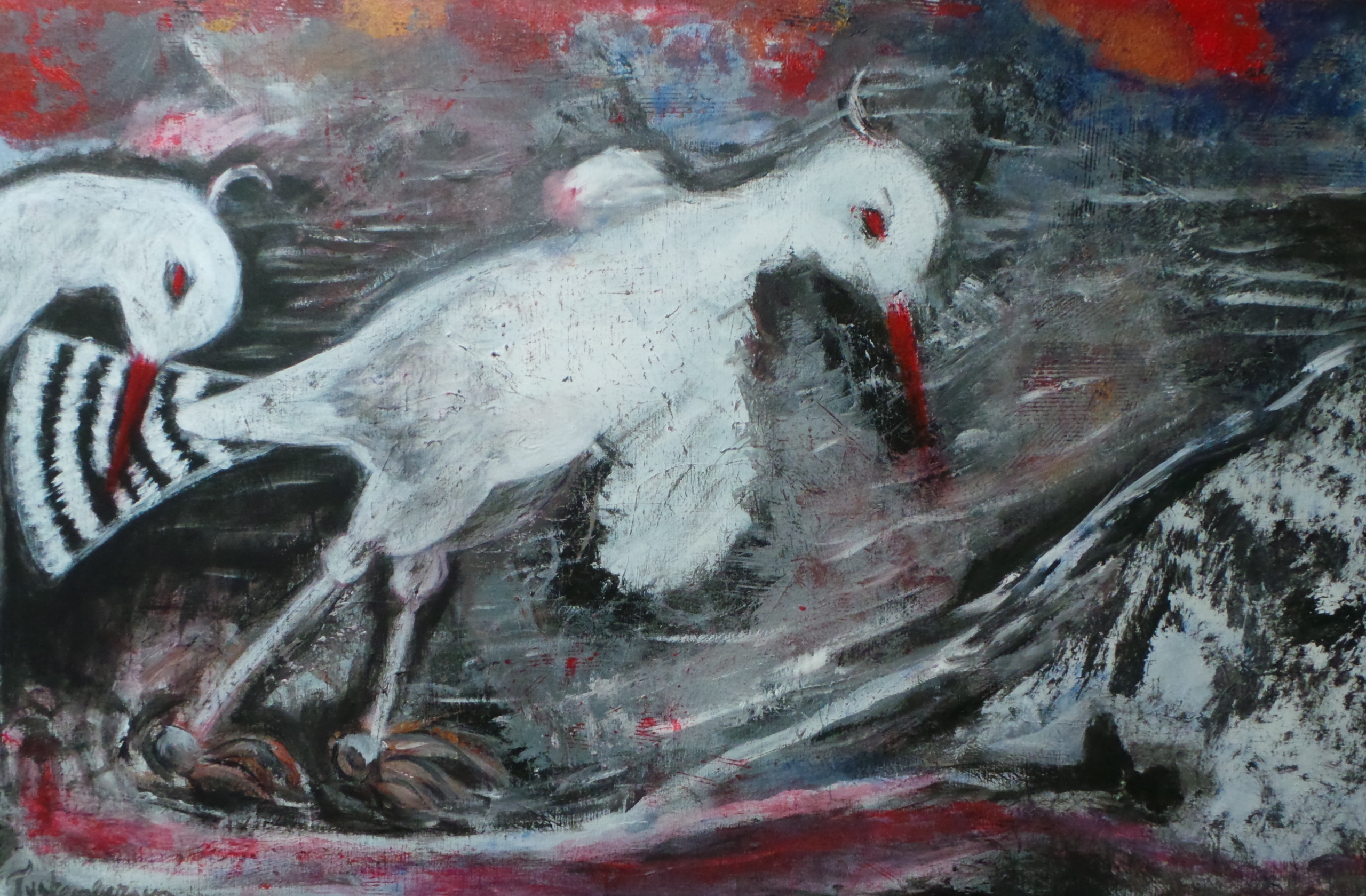 storm vogels in zeeland fantasie op linnen en alluminium houten frame, kan niet krom trekken!