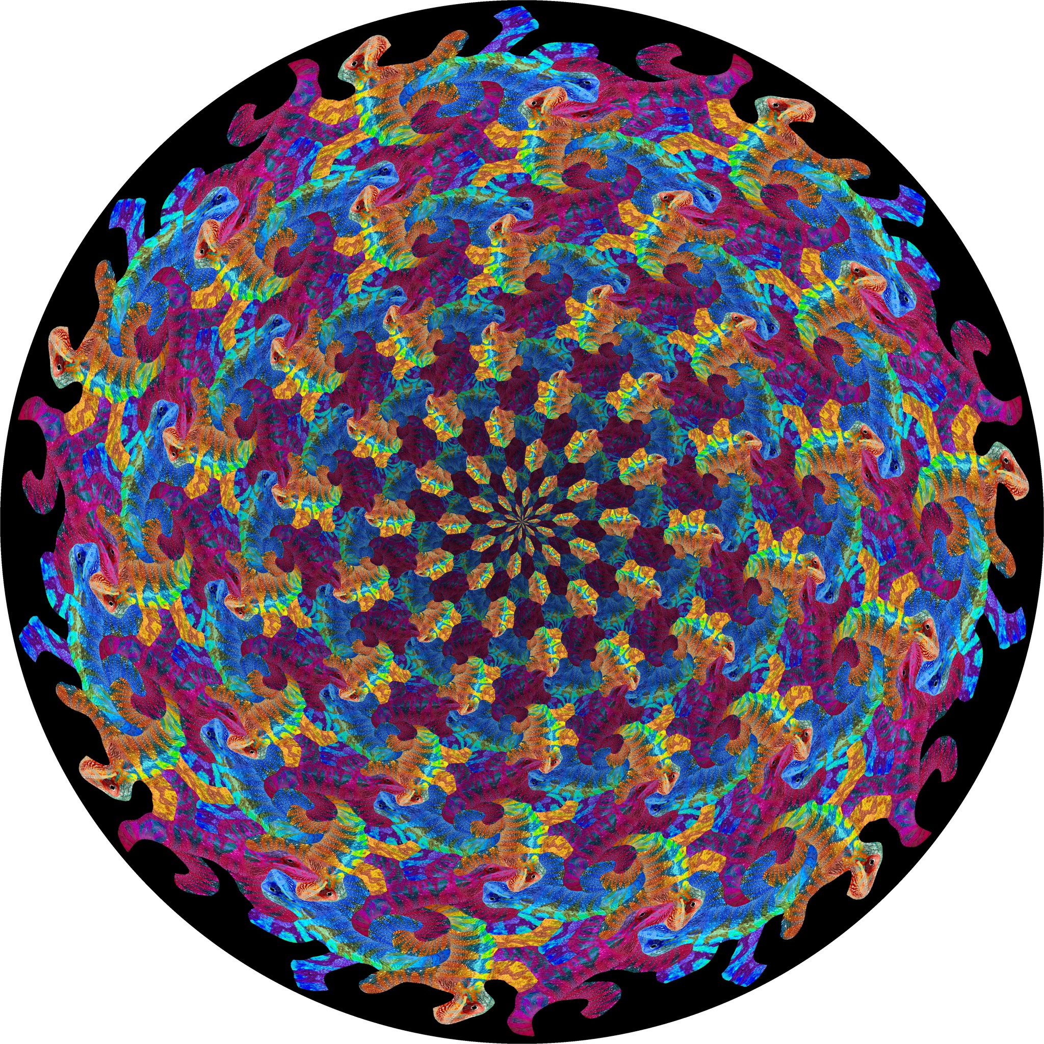 De reptielen veranderen in zeshoeken bij nadering van het midden. Deze ruimtevullende vlakvulling van concentrische cirkels bevat een draai om de impliciete spiraalpatronen te benadrukken. De ronde schijf wordt afgedrukt als gallery-bond (tussen acrylglas en aluminium).