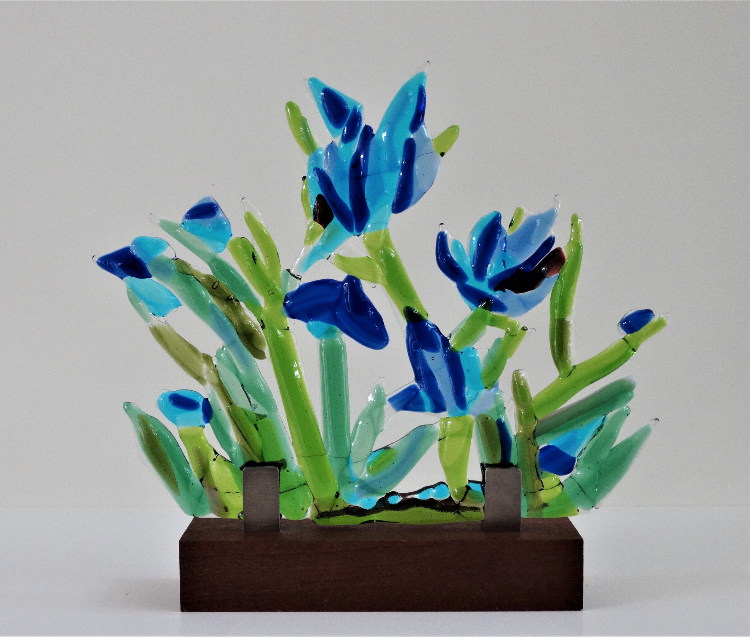 Blauwe bloemen, glasobject met een open structuur in rvs-houders op een sokkel van hardhout.