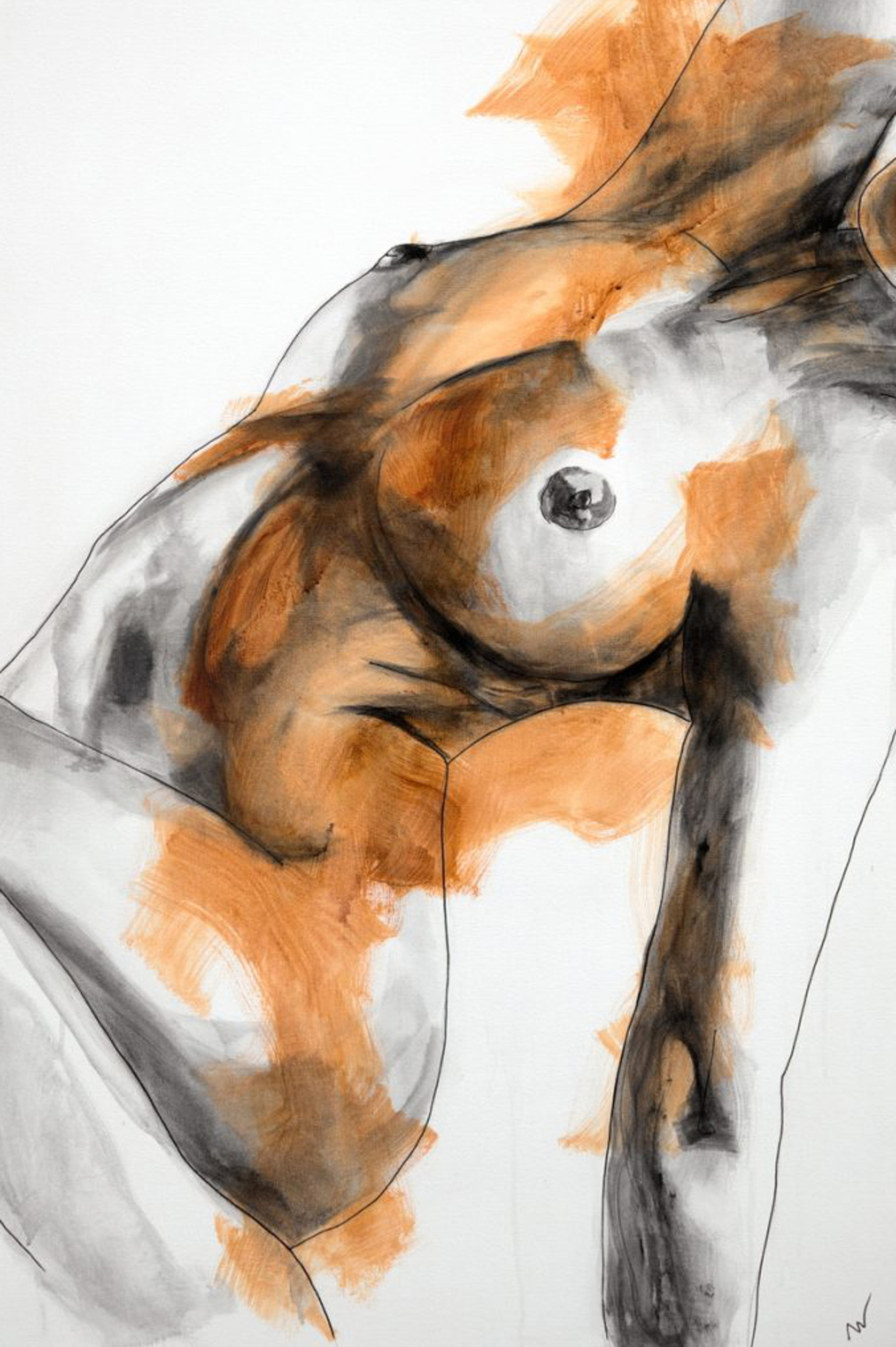 De zachtheid van de vrouw weergegeven in zwart en vlammend burned sienna, vlak en lijn. Hoort bij Fire 2