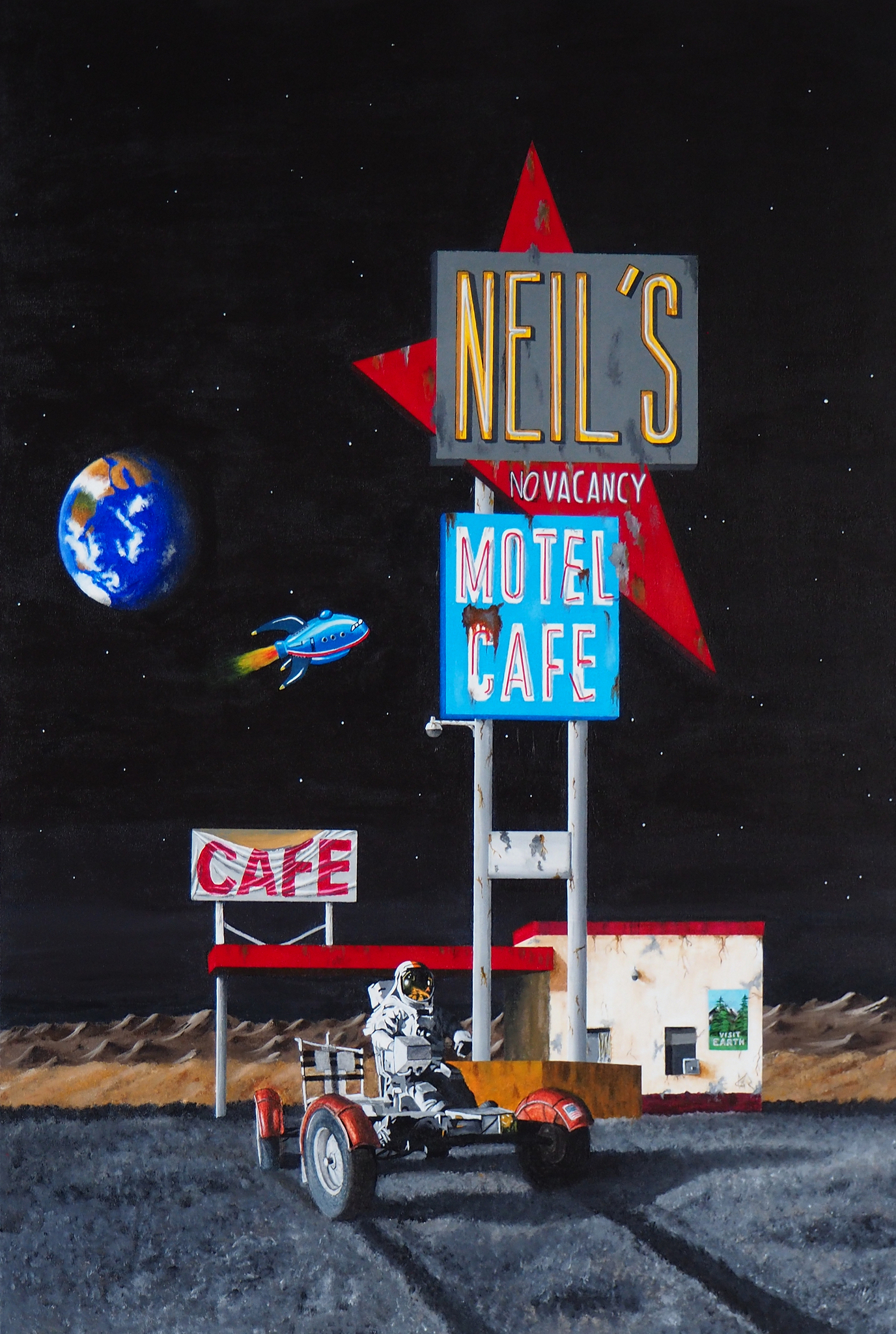 Surrealistisch beeld van een oude maanbasis waar gepromoot wordt om Aarde te bezoeken!
