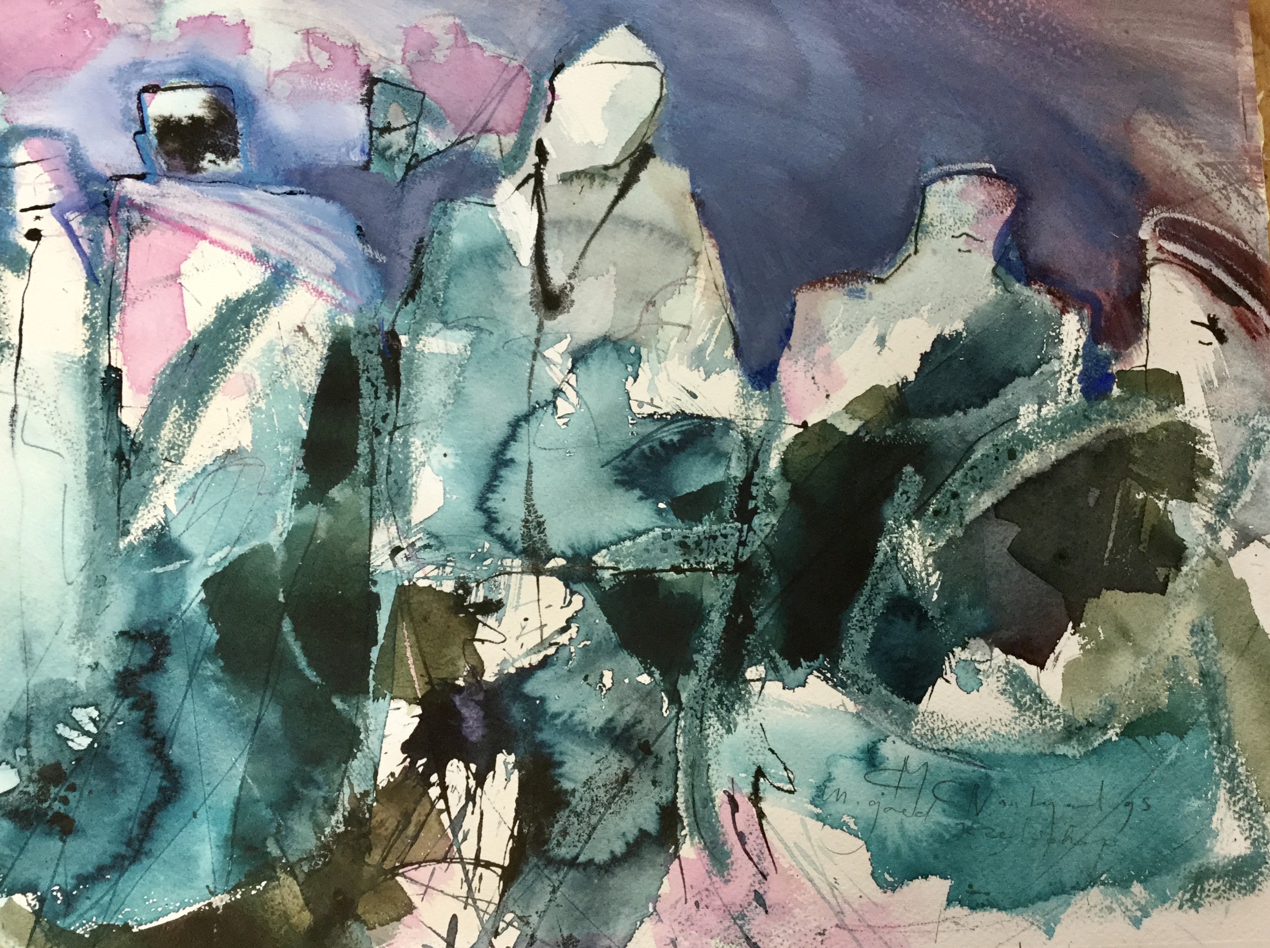 Het famillieportret is een aquarel met gemengde technieken ,er is ook in getekend met aquarelkrijt en geschilderd met acryl. Te zien zijn een aantel geabstraheerde figuren. De kleuren zij blauw grijs met hier en daar wat paars