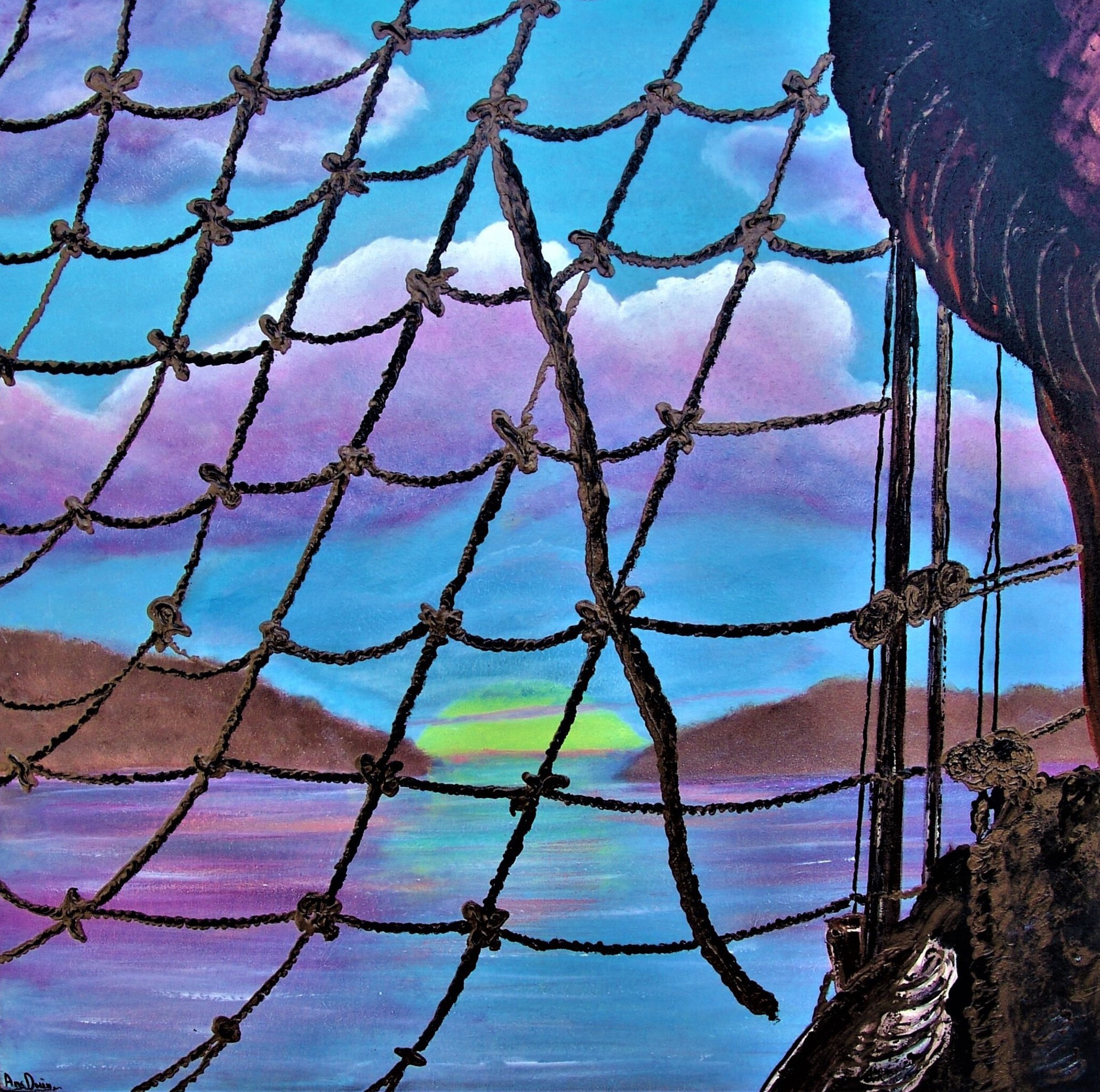 The rigging of the ship, painted with acrylic on cotton and finished with varnish. In the ropes s the colour gold and brons, very beautifull. Sides painted in gold (mat), no need for a list. Ready to hang.