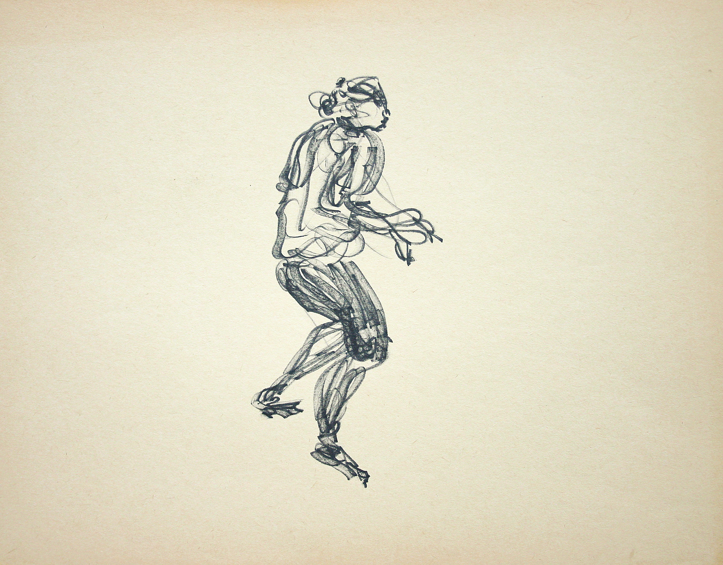 Schets van dansend persoon, met marker op papier.