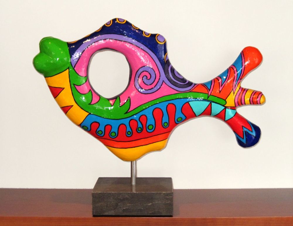 Freddi Fish is een kleurrijke vis die graag naar buiten wil. Een vrolijk beest in heldere, lichtechte kleuren. Het is uit hardschuim gebeeldhouwd in 2012 en afgewerkt met meerdere lagen kunsthars, acrylverf, sealer en vernis om het weersbestendig te maken. Freddi staat op een rvs-poot op een hardstenen sokkel van 20 x 20 x 5 cm. Totale afmeting is 60 x 48 x 20 cm. Gesigneerd en gedateerd, unica. Gewicht ong. 8 kg.