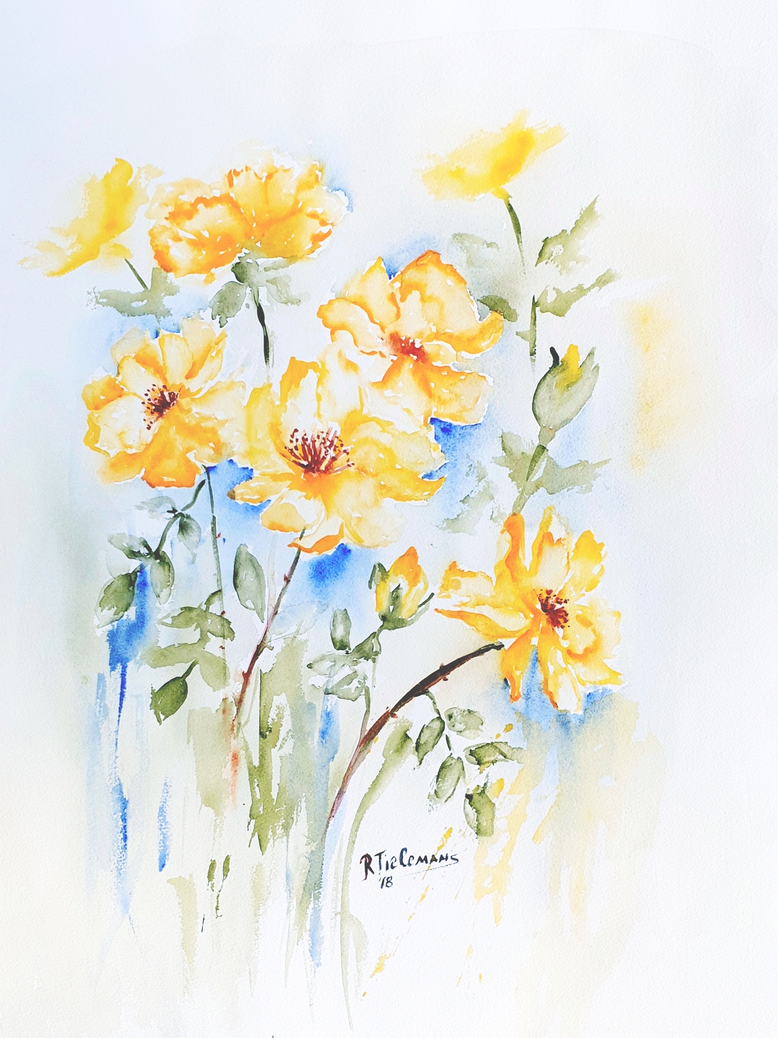Wit Geel Blauw Groen Bloemen Rozen Aquarel Natuur Gele