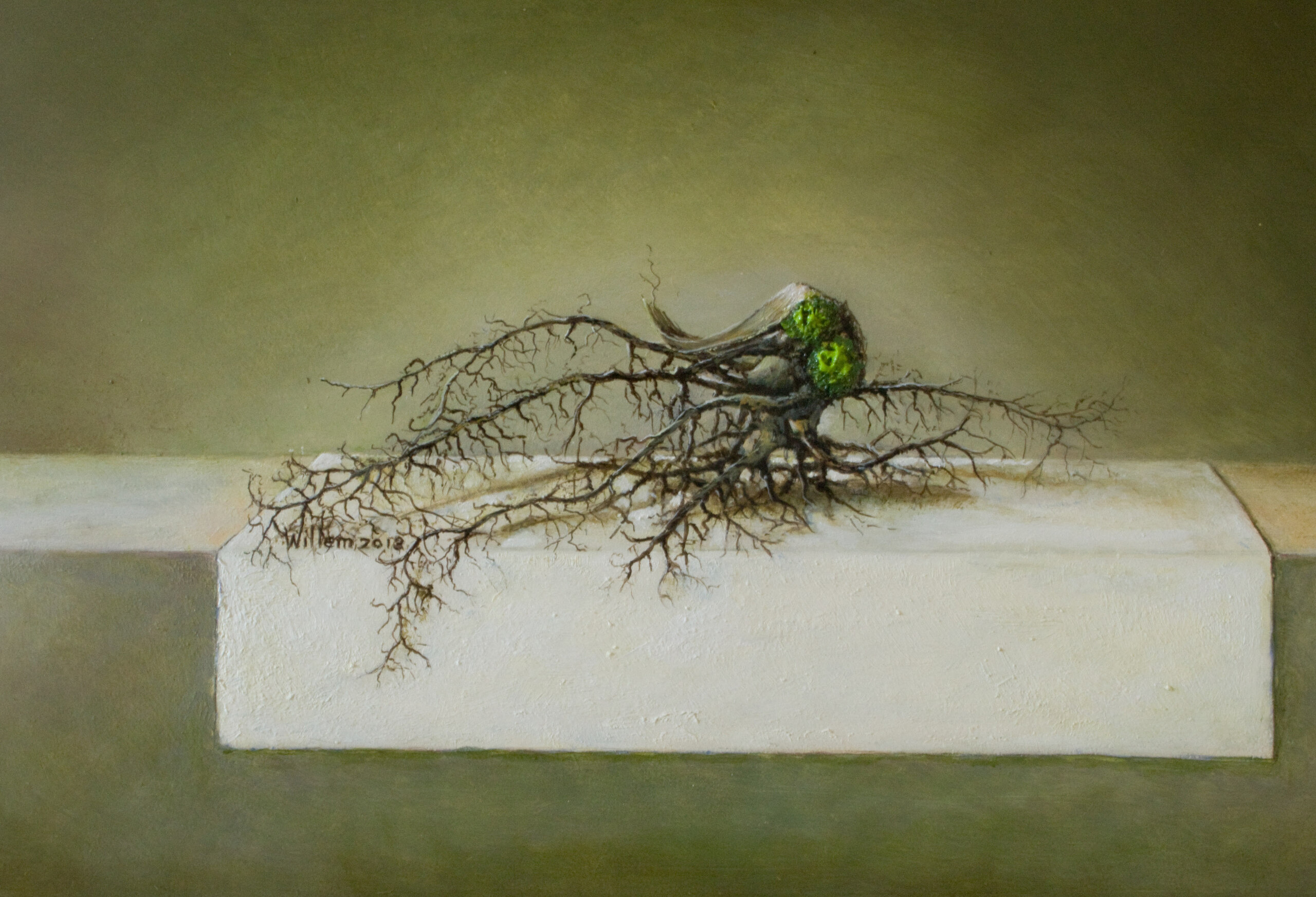 Een stuk wortel van een spruitkool die na de strenge winter twee kleine spruitkooltjes vertoont. Als in een "struggle for life "trachtten ze de winter te overleven.