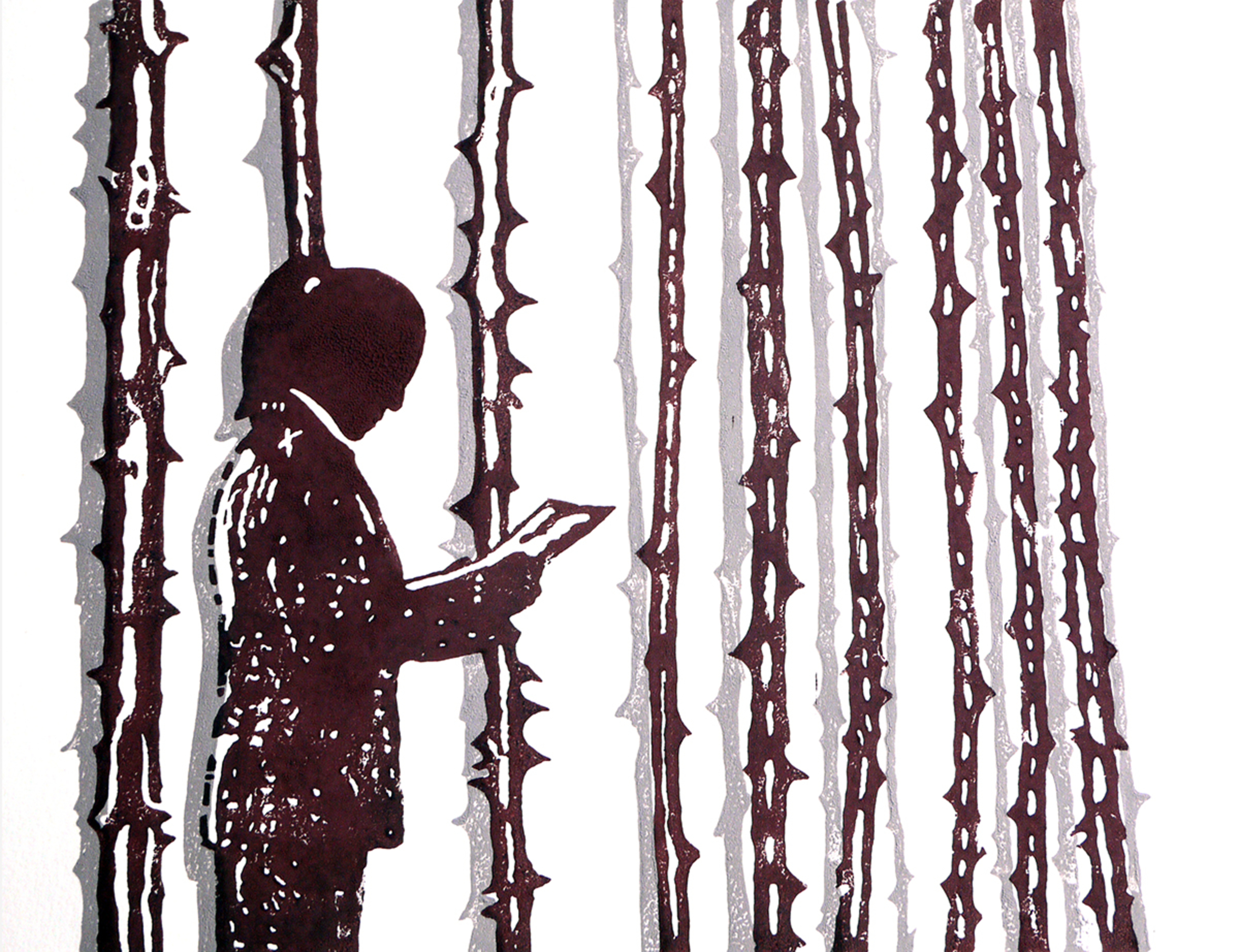 Linoleumsnede op aquarelpapier. N.a.v. de tentoonstelling van Herman de Vries in het Stedelijk Museum Alkmaar.
